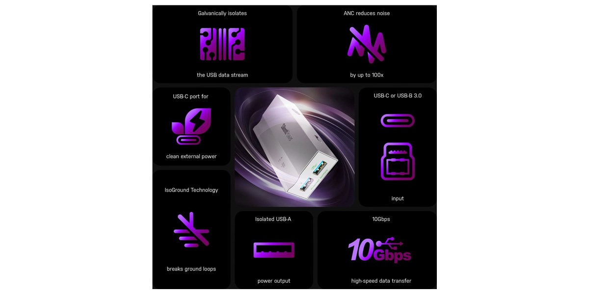 Au-delà de l’isolation, le iPurifier Pro intègre une technologie de réduction active du bruit comparable au principe des casques ANC. Il détecte les interférences électromagnétiques et radiofréquences présentes sur l’alimentation USB, puis génère un signal inverse pour les annuler. Ce traitement dynamique couvre une large bande de fréquences et permet d’abaisser significativement le plancher de bruit. Le résultat est une microdynamique plus fine, des attaques mieux détourées et des timbres plus naturels, sans dureté ni crispation.