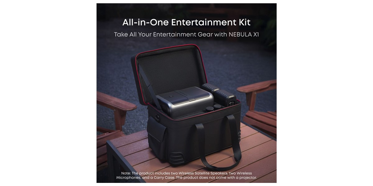 La mallette de transport rigide fournie est pensée pour accueillir le projecteur Nebula X1, les deux enceintes, les deux microphones et les câbles associés. Sa conception robuste et compacte protège efficacement l’ensemble lors des déplacements et simplifie l’organisation. Ce conditionnement fait du pack Nebula X1 une solution complète et prête à partir, idéale pour emporter son cinéma personnel en vacances, chez des amis ou sur tout lieu d’événement.