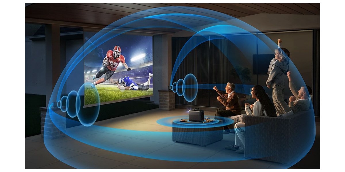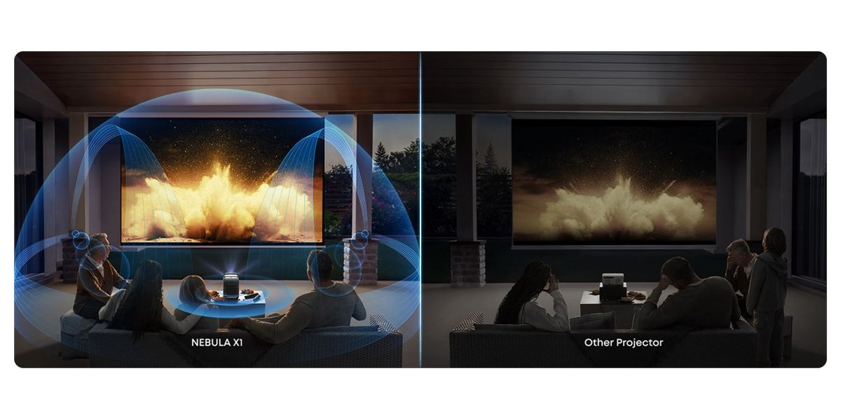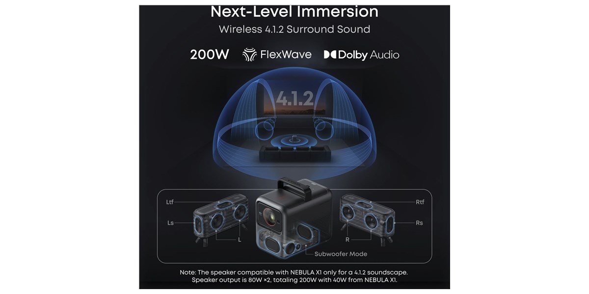 Le pack Nebula X1 repose sur une configuration audio 4.1.2 pensée pour envelopper les spectateurs. Les deux enceintes satellite sans fil de 80 W chacune, associées au canal de basses et aux canaux verticaux pris en charge par le système, délivrent une puissance totale jusqu’à 200 W, adaptée aux bandes-son de films, séries, concerts ou jeux. L’algorithme propriétaire FlexWave optimise la diffusion spatiale pour créer une scène sonore tridimensionnelle, avec des effets précis, des dialogues clairs et une ambiance immersive, même dans un jardin ou une grande pièce de vie.