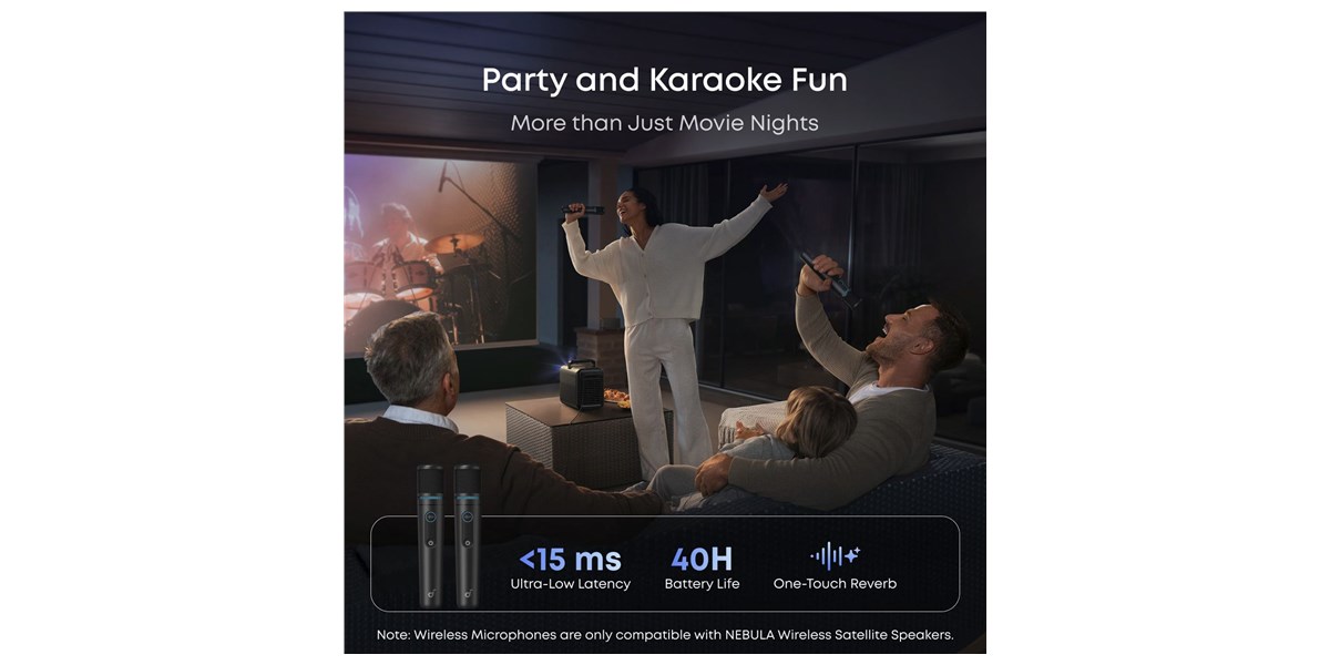 Les deux micros sans fil inclus viennent compléter le dispositif pour les usages festifs. Leur latence inférieure à 15 ms assure un retour quasi instantané de la voix, indispensable pour le karaoké ou la prise de parole. Avec une autonomie allant jusqu’à 40 heures, ils restent opérationnels sur de longues sessions sans recharge fréquente. L’activation d’un effet de réverbération en une touche permet d’obtenir un rendu plus vivant et valorisant pour les chanteurs occasionnels comme pour les animations. Ces microphones sont spécifiquement compatibles avec les enceintes du Nebula X1, garantissant une intégration cohérente du système.