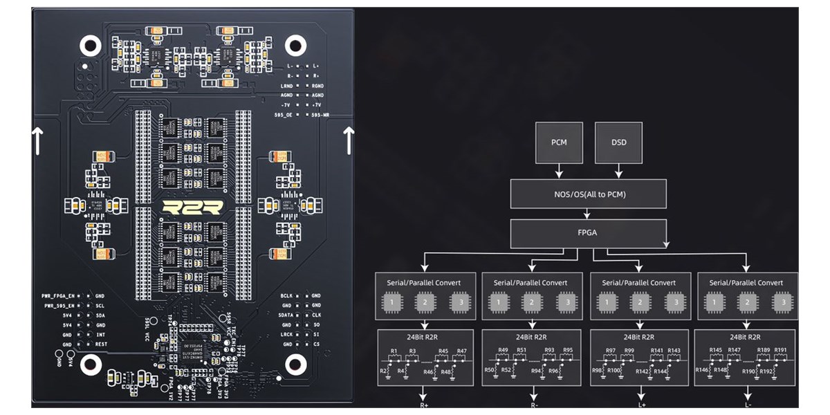 L’architecture R2R du FiiO K13 repose sur un réseau de 192 résistances de précision, permettant une conversion entièrement analogique des signaux numériques jusqu’à 32 bits / 384 kHz et DSD256. Contrairement aux DAC conventionnels, ce système sans suréchantillonnage (mode NOS) préserve toute la texture sonore originale, tandis qu’un mode OS est aussi disponible pour ceux préférant une restitution plus analytique. Le résultat est une écoute fidèle, chaleureuse et fluide, parfaitement adaptée à la musique Hi-Res.