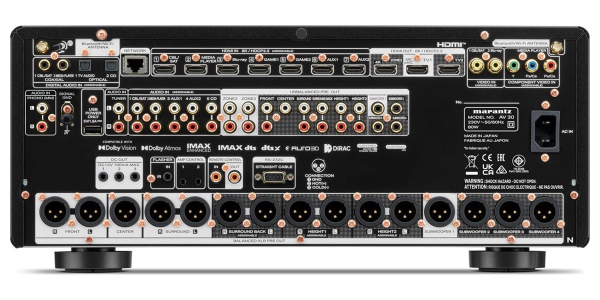 Conçu pour les expériences immersives, le Marantz AV 30 est compatible Dolby Atmos, DTS:X, Auro-3D et IMAX Enhanced. Il prend en charge jusqu’à 11.4 canaux, permettant des configurations flexibles comme 9.4.2 ou 7.4.4. Il intègre aussi les technologies Dolby Atmos Height Virtualization et DTS Virtual:X pour recréer un son 3D même avec moins d’enceintes. Que vous soyez devant un film d’action ou un concert live, l’AV 30 vous place au cœur de la scène sonore.