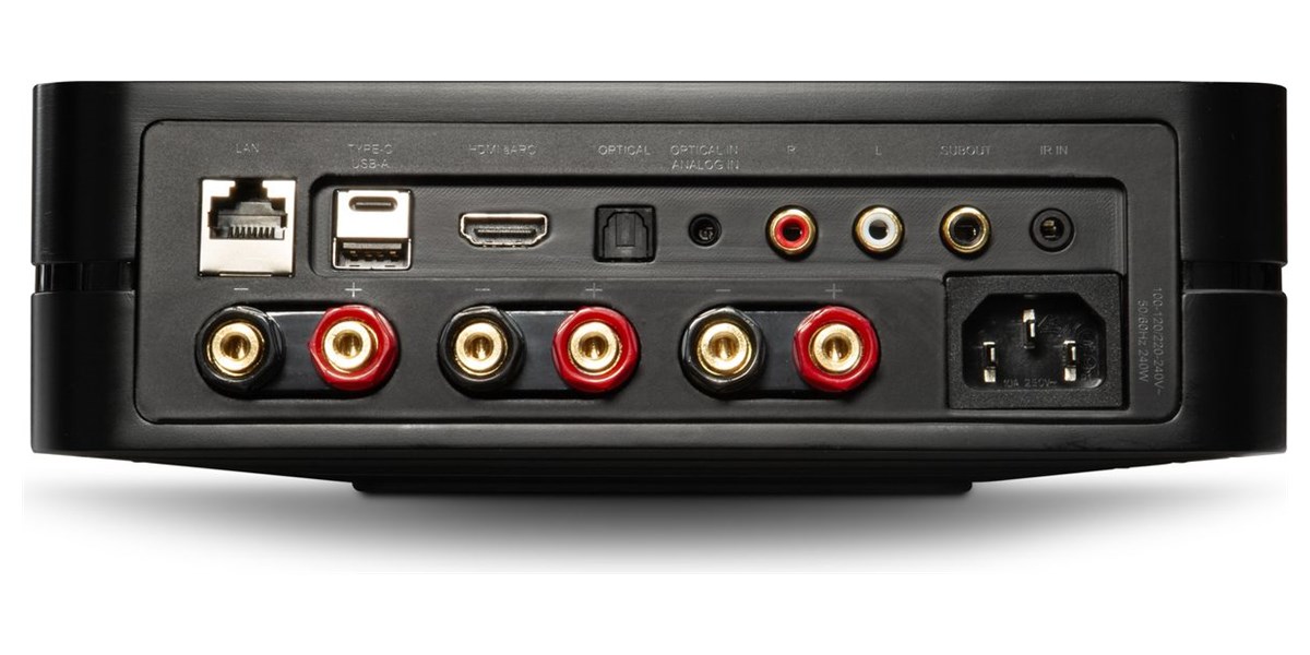 Le Powernode (2025) propose une connectique très complète : HDMI eARC, RCA, optique, USB-A, USB-C, Ethernet, Wi-Fi, sortie subwoofer et sortie casque THX 6,35 mm. Il peut ainsi accueillir une grande variété de sources comme une platine vinyle, un ordinateur ou un lecteur CD. Il prend également en charge la calibration Dirac Live (en option), permettant d’optimiser automatiquement le son en fonction de l’acoustique de la pièce.