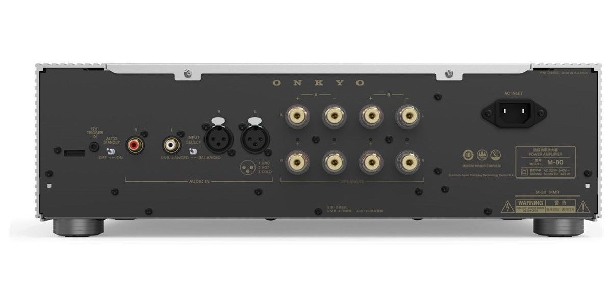 Pour s’intégrer facilement dans un système hi-fi, le M-80 propose une entrée RCA asymétrique et une entrée XLR symétrique. Ses borniers haut de gamme permettent de raccorder une ou deux paires d’enceintes (A/B), avec un transfert de puissance optimal. Une prise trigger 12 V complète l’équipement pour une mise en marche synchronisée avec un préampli tel que l’Onkyo Icon P-80.