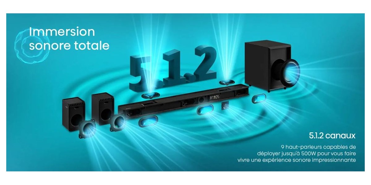 La configuration 5.1.2 canaux combinée à neuf haut-parleurs permet une reproduction précise du son dans toutes les directions. Les effets sonores verticaux vous plongent encore plus dans l’action, que ce soit pour un film d’action, une série ou un jeu vidéo. Le caisson de basses sans fil fournit des basses puissantes et profondes tandis que les enceintes satellites assurent une spatialisation sonore immersive.