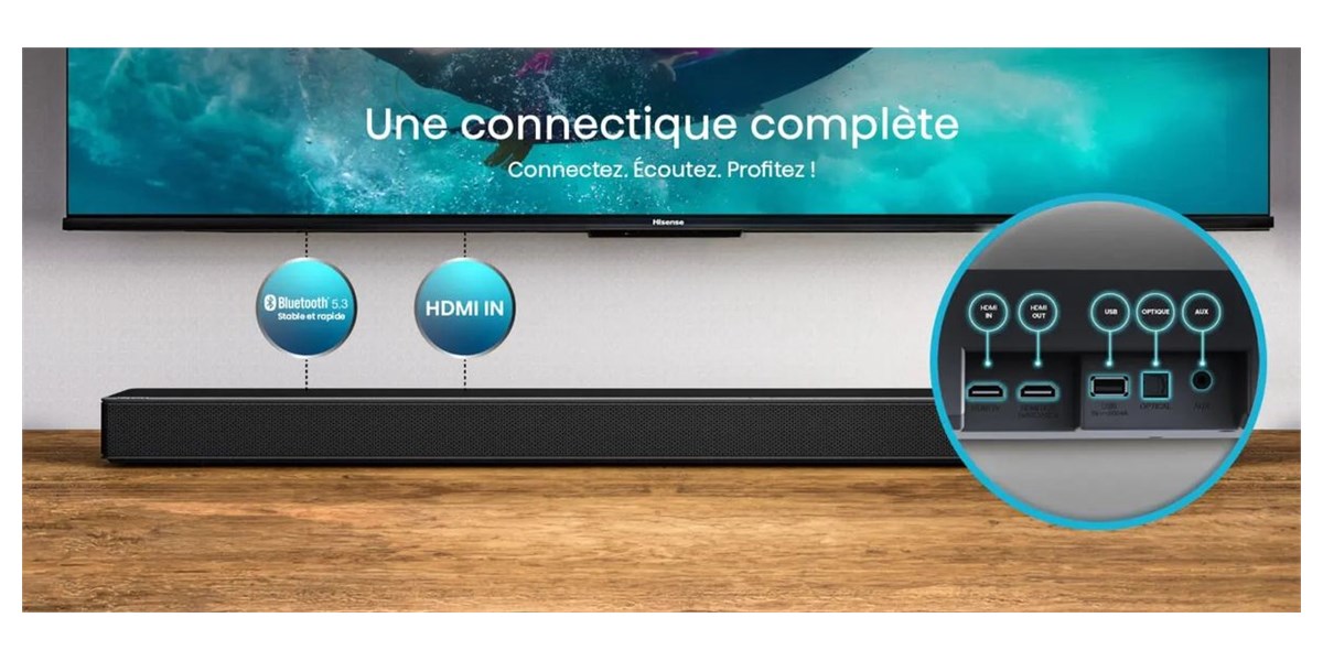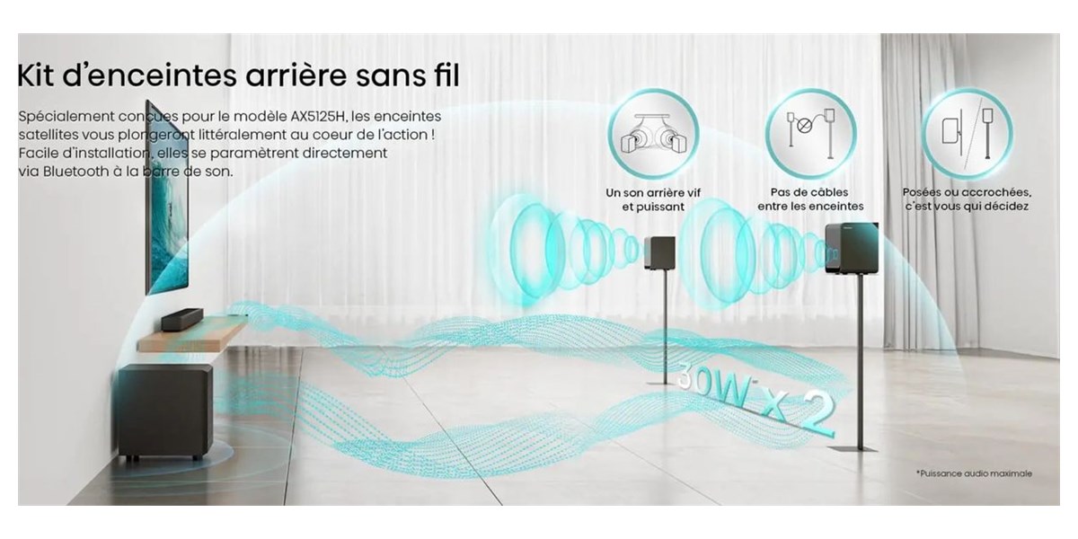 La Hisense AX5125H combine puissance, immersion et simplicité d'utilisation. Avec ses nombreuses compatibilités audio, son système sans fil complet et sa connectique moderne, elle s'impose comme un excellent choix pour améliorer votre expérience home-cinéma.