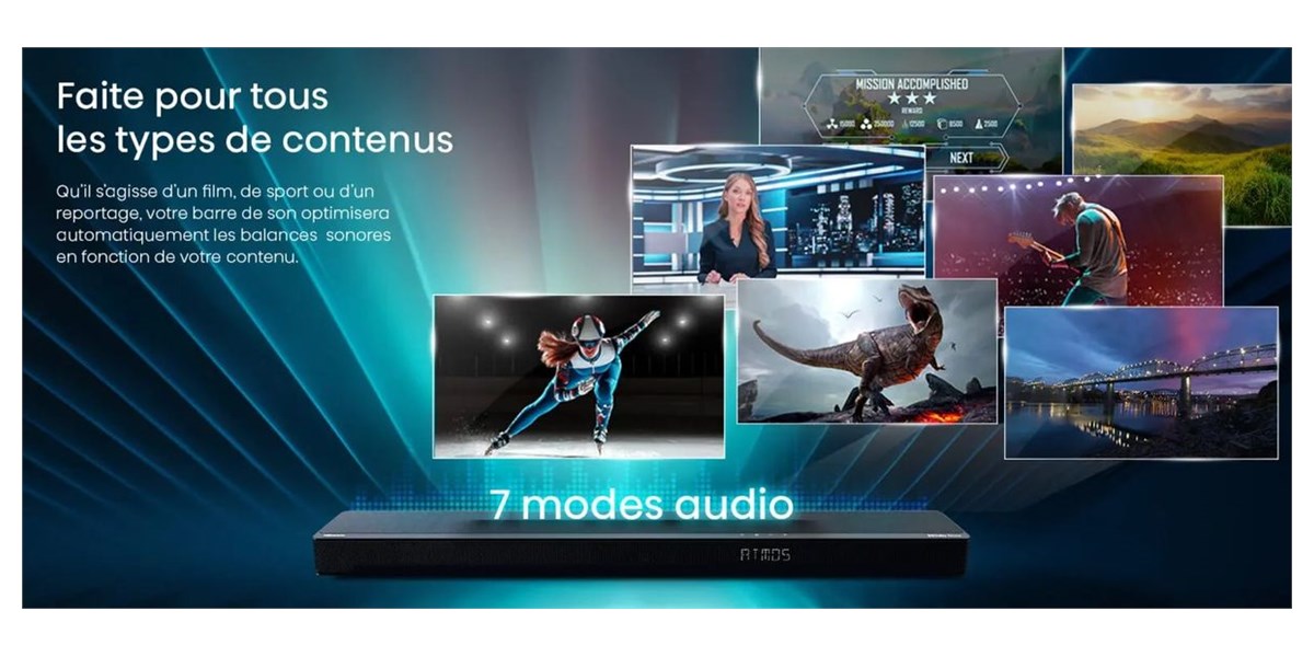 La barre de son prend en charge les formats Dolby Atmos, Dolby TrueHD, DTS:X, entre autres, pour un rendu sonore multicanal haute fidélité. Chaque détail est restitué avec clarté, des dialogues aux effets spéciaux, pour une immersion maximale dans tous vos contenus.