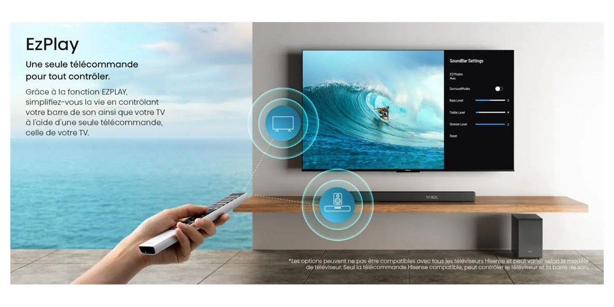 La fonction EzPlay permet d’utiliser la télécommande du téléviseur Hisense pour contrôler la barre de son, simplifiant ainsi la gestion de votre installation audio sans ajouter d’accessoire supplémentaire.