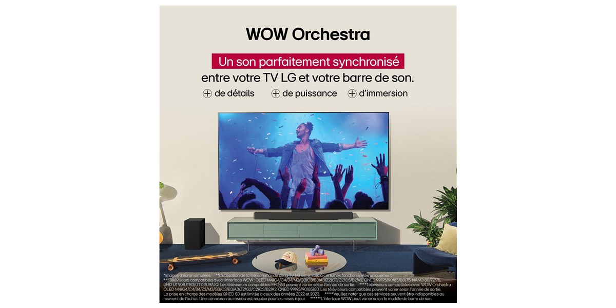 Outre ses capacités techniques, le LG S70TY se distingue par ses fonctionnalités axées sur le confort d'utilisation. La télécommande simplifiée, la possibilité de montage mural et les différents modes sonores pré-réglés, comme le mode Cinéma ou Musique, adaptent l'expérience audio au contenu visionné. La technologie WOW Orchestra permet en outre de coupler le son du téléviseur LG avec celui de la barre pour une scène sonore élargie, faisant de chaque visionnage une expérience unique.