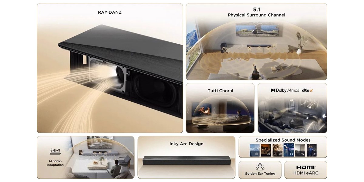 La technologie Ray•Danz permet à la barre de son de diffuser un son large et immersif en exploitant la réflexion acoustique plutôt que des effets numériques artificiels. Cette approche garantit une scène sonore ouverte, précise et naturelle, idéale pour tous les types de contenu, des films aux jeux vidéo.