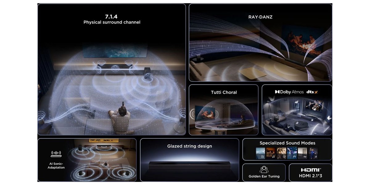 La TCL Q85H Pro redéfinit l’expérience audio à domicile avec un système complet 7.1.4, une puissance impressionnante de 860 W et des technologies immersives de pointe. Équipée de la technologie Ray•Danz, du Dolby Atmos et du DTS:X, elle plonge l’utilisateur dans un son tridimensionnel réaliste, avec des effets sonores aériens et latéraux. Son caisson de basses sans fil et ses satellites arrière sans fil offrent une scène sonore enveloppante et parfaitement équilibrée. Pensée pour les passionnés de cinéma et de musique, elle s’intègre facilement dans tous les intérieurs grâce à un design raffiné et des matériaux durables.