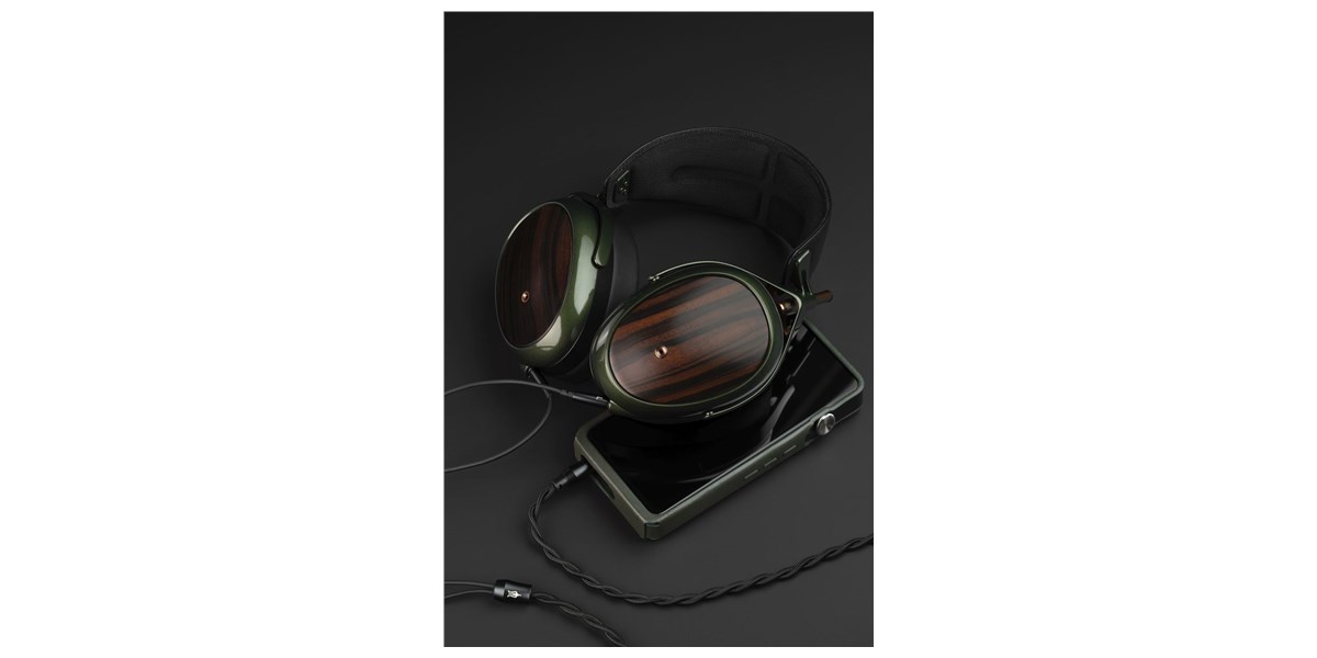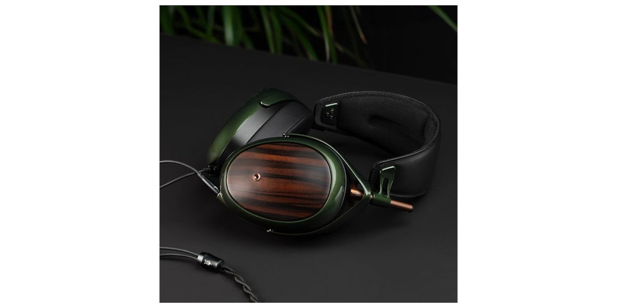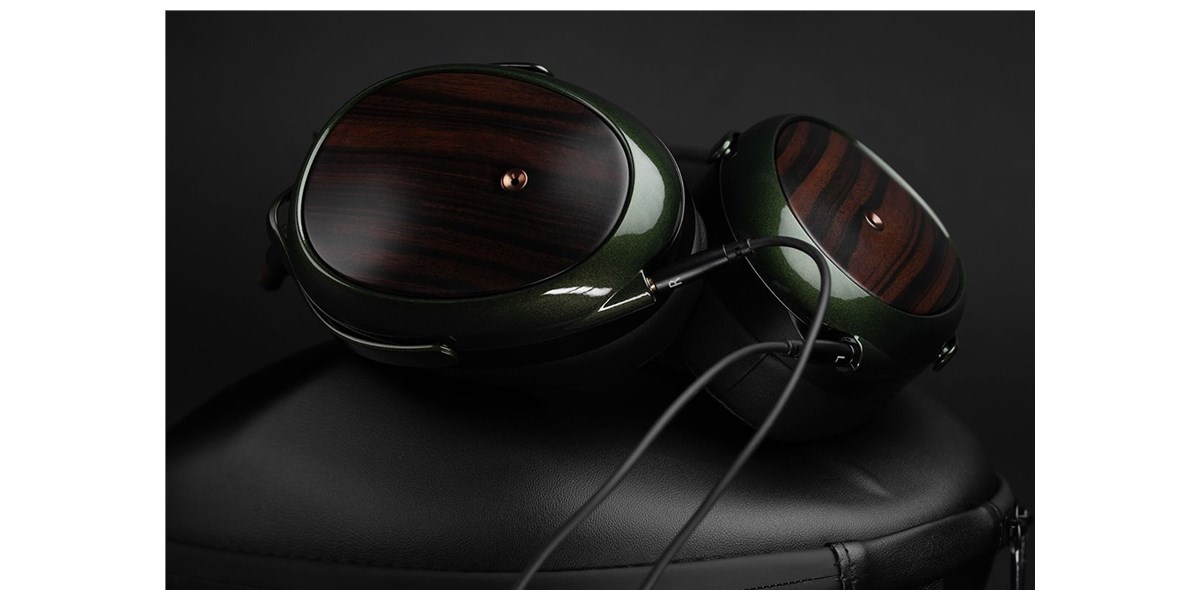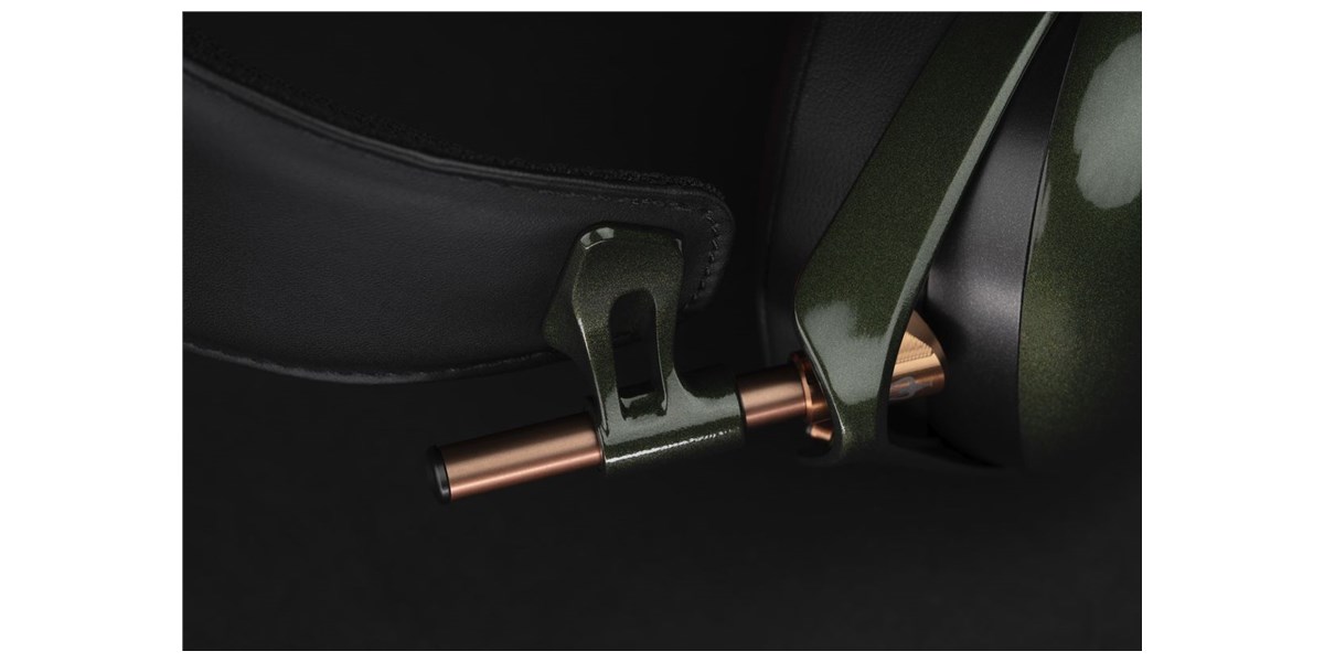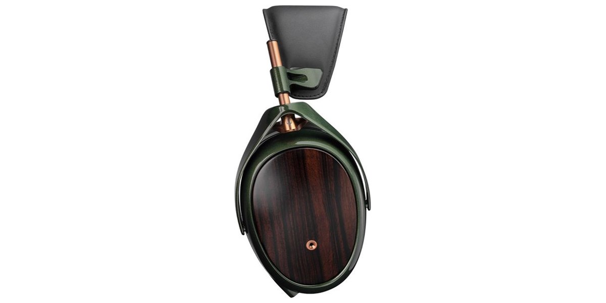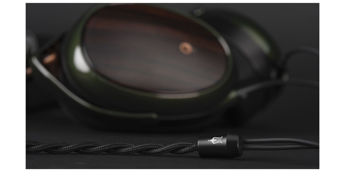 Le casque se distingue par une conception esthétique particulièrement soignée. Les coques sont réalisées en ébène de Macassar, un bois dense aux veinures uniques qui confère à chaque exemplaire une identité visuelle propre. Cette essence noble est associée à une structure en magnésium légère et résistante, habillée d’une finition vert métallisé appliquée en plusieurs couches. Le bandeau et les coussinets sont recouverts d’un revêtement doux assurant un toucher agréable et une excellente durabilité.