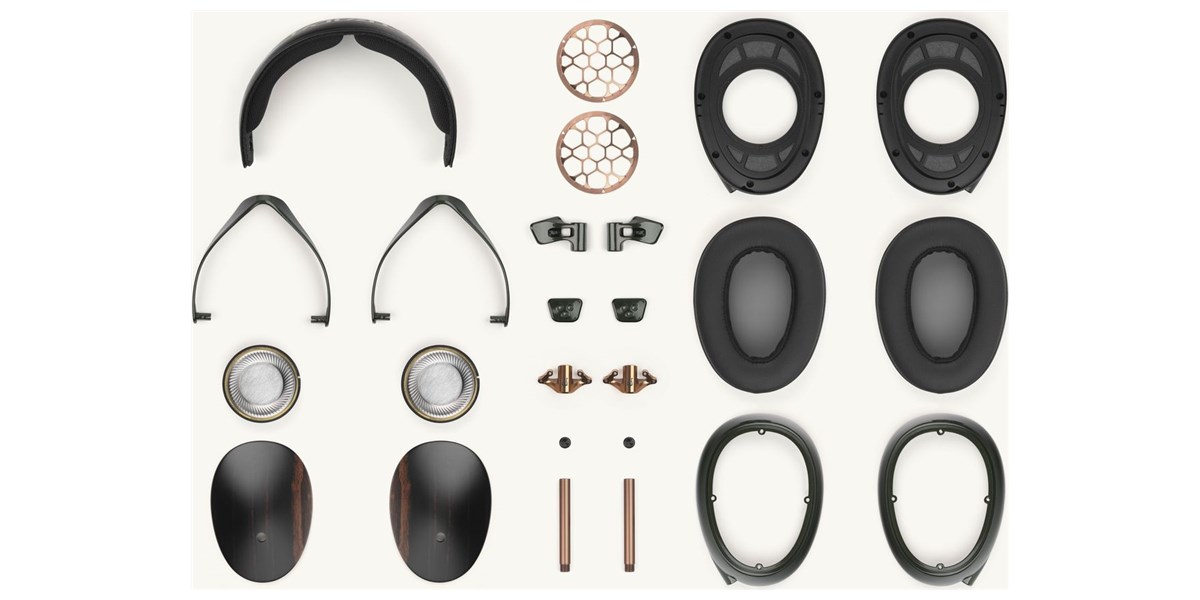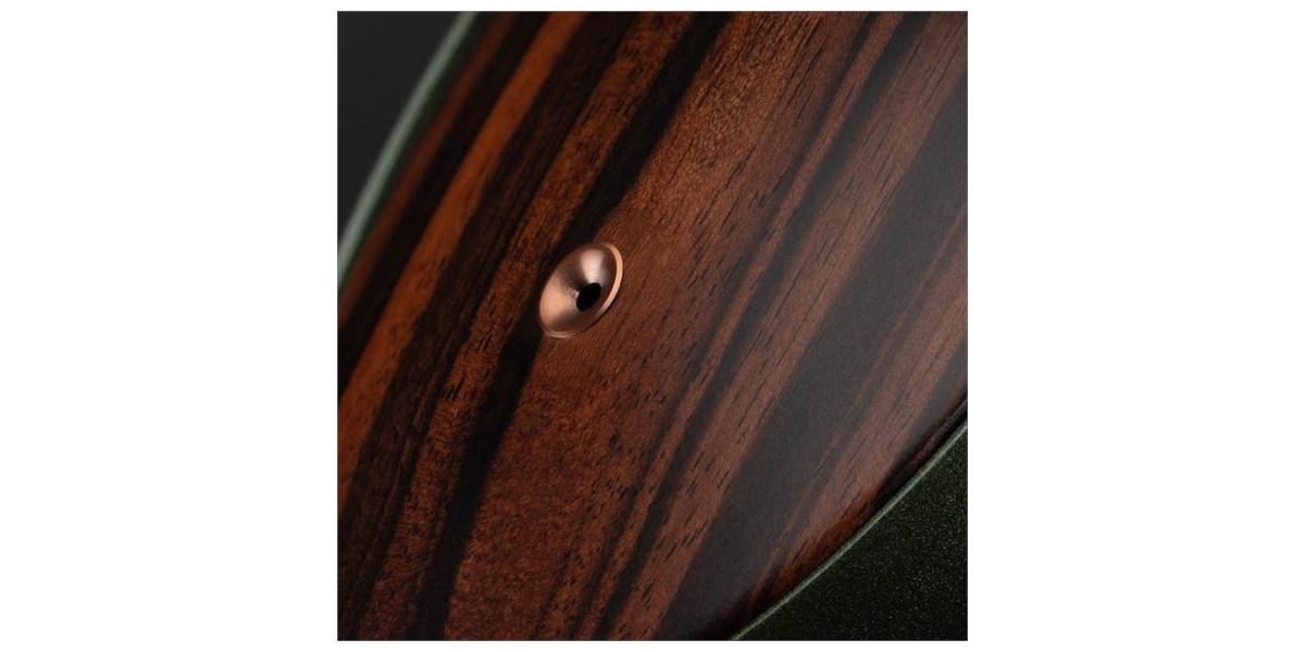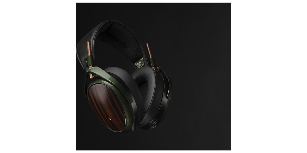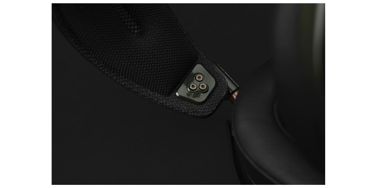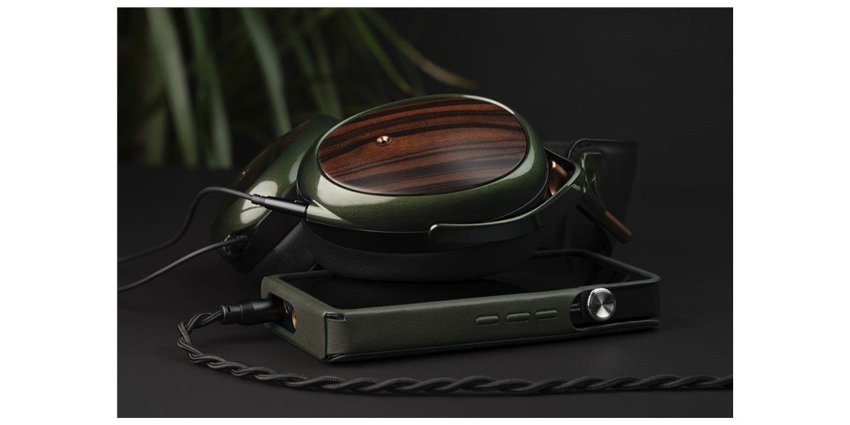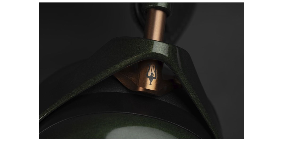 Le casque se distingue par une conception esthétique particulièrement soignée. Les coques sont réalisées en ébène de Macassar, un bois dense aux veinures uniques qui confère à chaque exemplaire une identité visuelle propre. Cette essence noble est associée à une structure en magnésium légère et résistante, habillée d’une finition vert métallisé appliquée en plusieurs couches. Le bandeau et les coussinets sont recouverts d’un revêtement doux assurant un toucher agréable et une excellente durabilité.