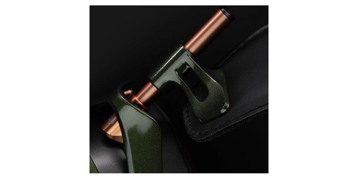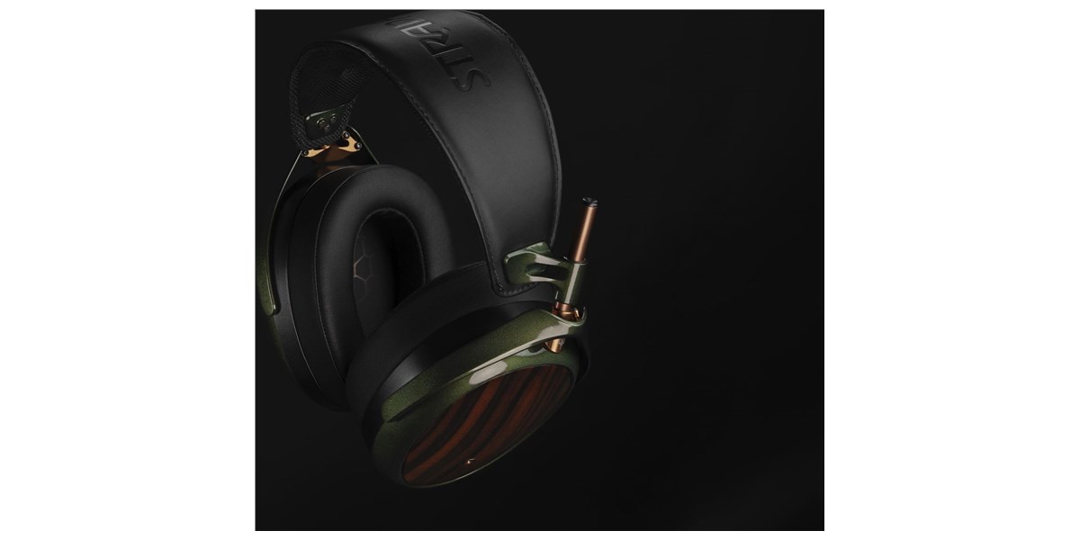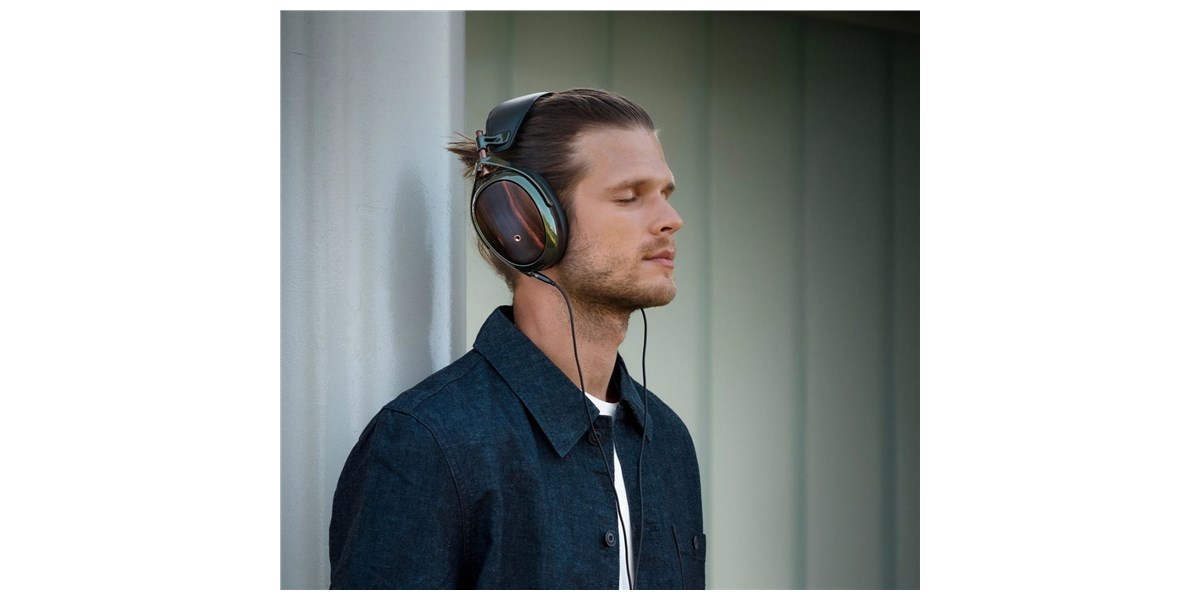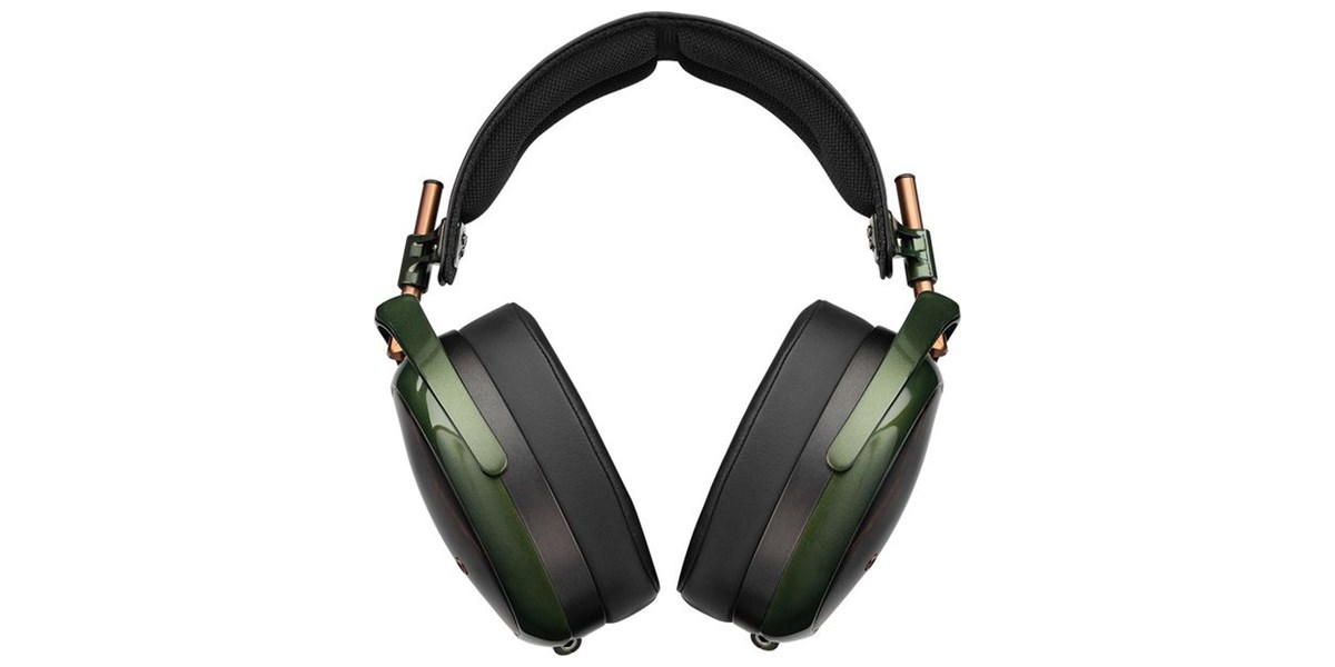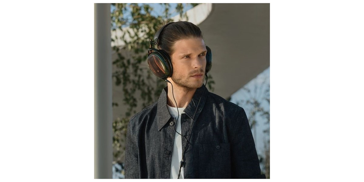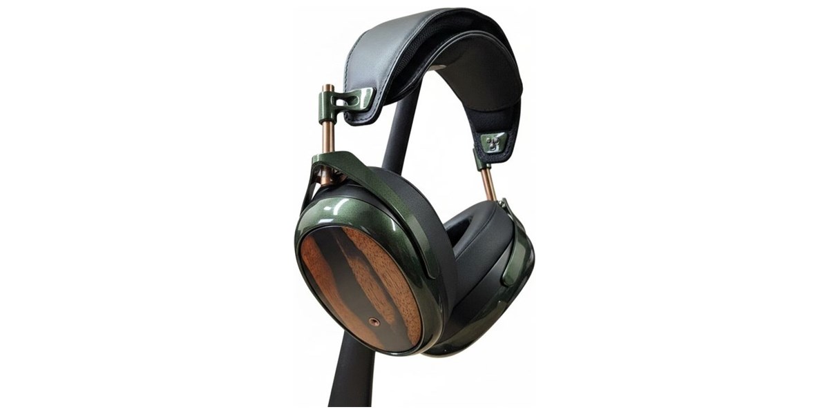 Le casque se distingue par une conception esthétique particulièrement soignée. Les coques sont réalisées en ébène de Macassar, un bois dense aux veinures uniques qui confère à chaque exemplaire une identité visuelle propre. Cette essence noble est associée à une structure en magnésium légère et résistante, habillée d’une finition vert métallisé appliquée en plusieurs couches. Le bandeau et les coussinets sont recouverts d’un revêtement doux assurant un toucher agréable et une excellente durabilité.