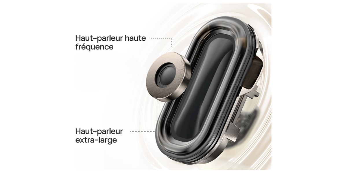 Chaque oreillette embarque un transducteur dynamique et un tweeter dédié, formant une architecture acoustique deux voies. Associée à la technologie DirectPitch 2.0, elle garantit une meilleure répartition des fréquences, tandis que l’algorithme OpenBass 2.0 restitue des basses maîtrisées sans obstruer l’oreille. Le rendu sonore se distingue par son équilibre et sa précision, tout en conservant la sécurité de l’écoute ouverte.