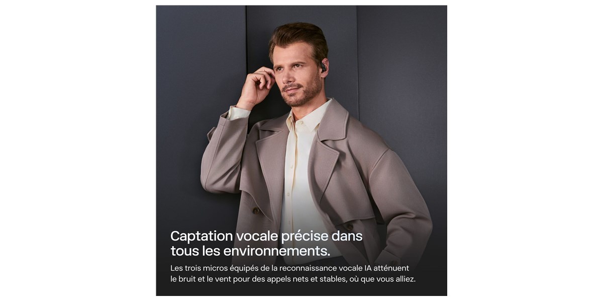 La structure légère avec crochets d’oreille en alliage nickel-titane recouverts de silicone ultra-doux assure un maintien confortable sur de longues périodes, que ce soit en marche, au bureau ou en séance de sport. Le modèle est certifié IP55 pour la résistance à l’eau et à la poussière, adapté aux activités quotidiennes ou à l’effort.