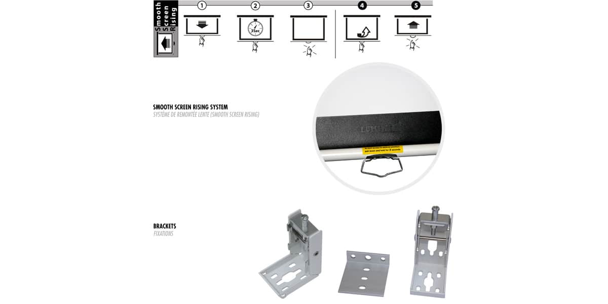 Le système de fixation, rapide et sûr, s'effectue à l'aide de clips qui permettent un montage au mur ou au plafond. Il est également possible de suspendre l'écran.Les deux accroches variables s'ajustent à vos besoins et offrent une grande latitude de placement des points de support : un plus important pour les installations dans des conditions difficiles.