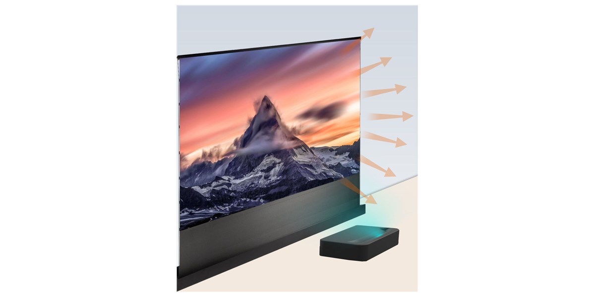 La technologie ALR (Ambient Light Rejection) intégrée à la toile permet de rejeter une grande partie de la lumière ambiante provenant de l’environnement, afin de conserver une image lisible et dynamique même dans un salon partiellement éclairé. L’écran reste ainsi exploitable en journée ou en présence de sources lumineuses modérées, sans subir le voile gris habituel des toiles classiques. Les bords noirs renforcent la perception du contraste en délimitant précisément l’image, tandis que le dos noir occultant bloque toute lumière arrière, autorisant une installation devant une fenêtre ou un mur clair sans fuite lumineuse. Le spectateur profite d’un noir plus profond, de couleurs plus denses et d’un relief renforcé pour tous les contenus.