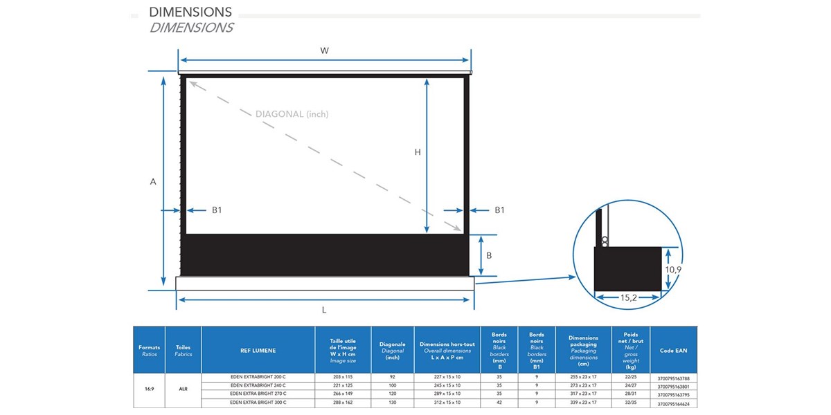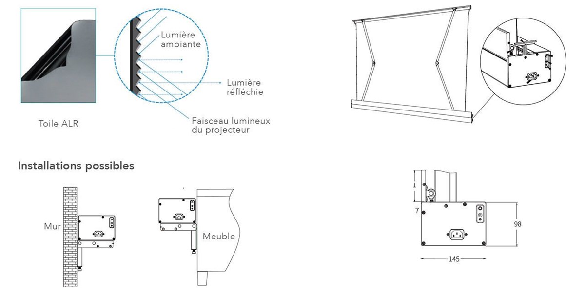 | Surface de projection | Toile PVC ALR (Rejet de Lumière Ambiante) |