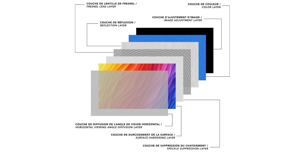 La toile Fresnel intègre sept couches optiques de microstructures holographiques permettant un contrôle précis des angles de réflexion. Cette conception avancée rejette jusqu’à 95 % de la lumière ambiante sur trois côtés, éliminant les points chauds et les reflets parasites. Avec un gain de 1 et une luminosité jusqu’à 100 fois supérieure à celle d’un écran classique dans les mêmes conditions, l’image reste éclatante, lisible et dynamique en pleine journée. Les noirs gagnent en profondeur, les couleurs conservent une fidélité annoncée à 98 %, offrant un rendu proche d’un grand téléviseur haut de gamme, mais avec le confort d’une très grande diagonale.