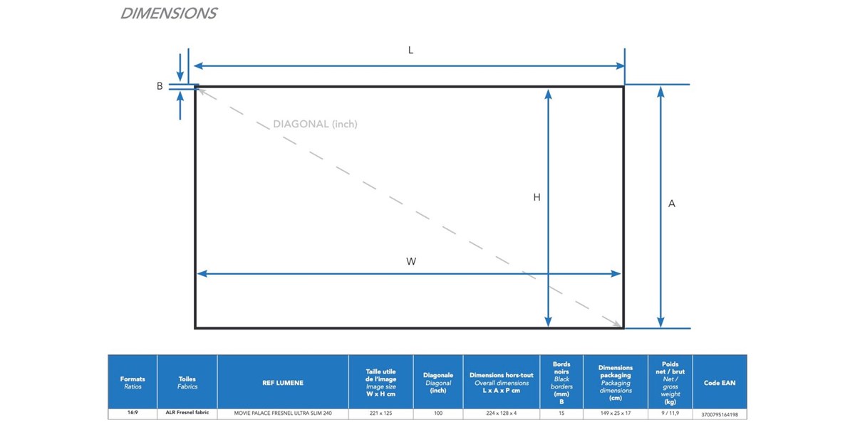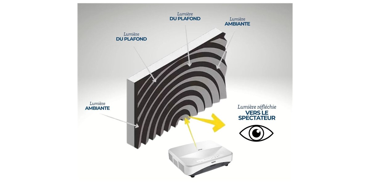 | Surface de projection | Toile PVC ALR (Rejet de Lumière Ambiante) |