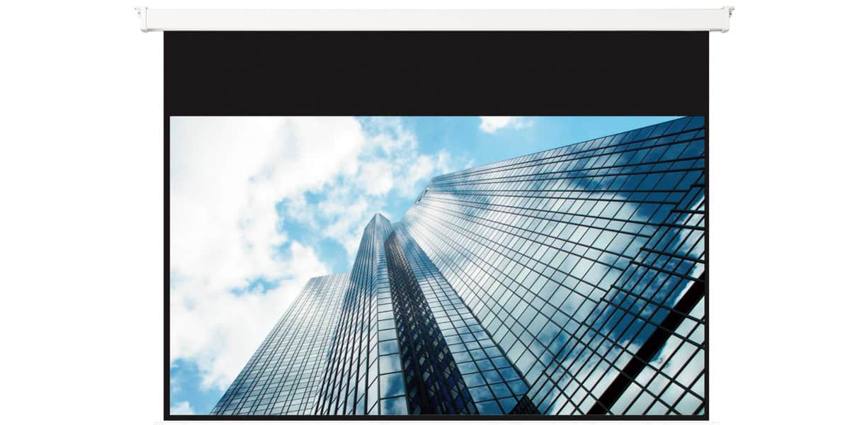 Ecran de projection manuel 16/9ème Oray 2000 HC sous carter en tôle d'acier laqué blanc. Surface de projection 97 x 172 cm, toile blanc mat occultante avec bordures noires. Fixations mixtes murales et plafond, intégrées aux extrémités de l'écran. Dispositif d'arrêt toutes hauteurs (tous les 10 cm environ).