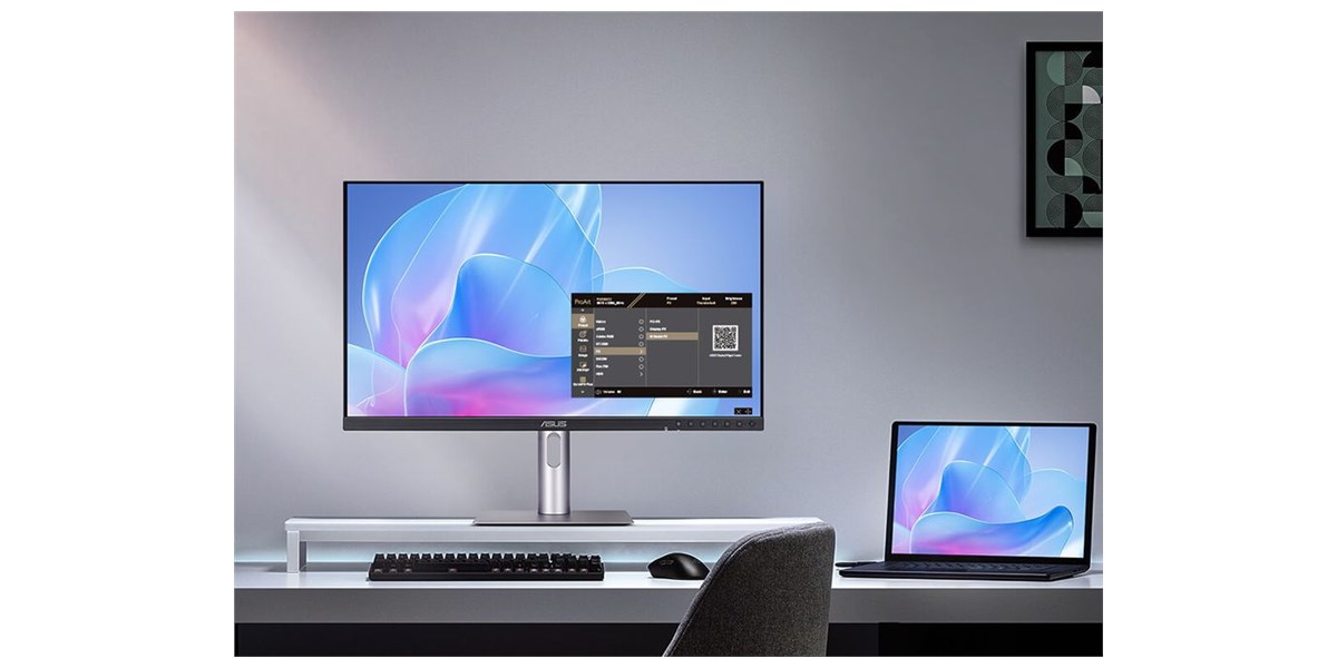 L'écran couvre 98 % du DCI-P3 et 100 % du sRGB avec une profondeur 10 bits. Chaque unité est calibrée en usine avec un Delta E inférieur à 2 et certifiée Calman Verified. Les modes ProArt Preset, dont le nouveau M Model-P3 optimisé pour macOS, garantissent une parfaite cohérence entre appareils Apple et moniteur.
