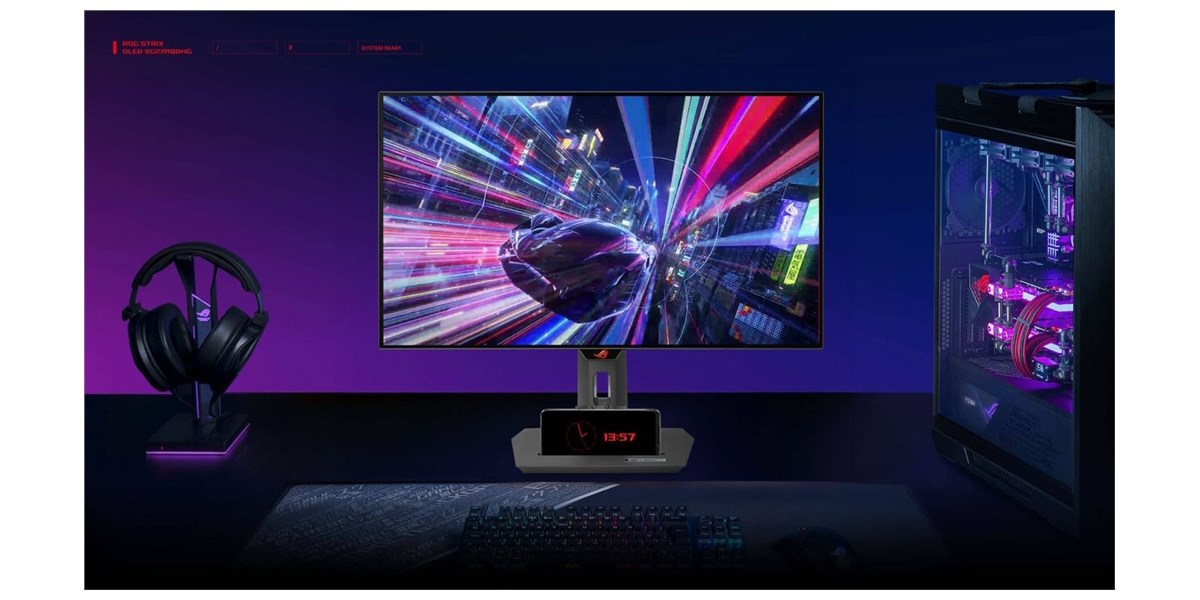 Le pied ajustable offre des réglages complets : hauteur, inclinaison, rotation latérale et mode portrait. Le capteur Neo détecte la présence de l'utilisateur pour activer l'écran, prolongeant la durée de vie de la dalle OLED. ASUS OLED Care Pro intègre des outils de protection comme le déplacement d’image et le nettoyage automatique des pixels.