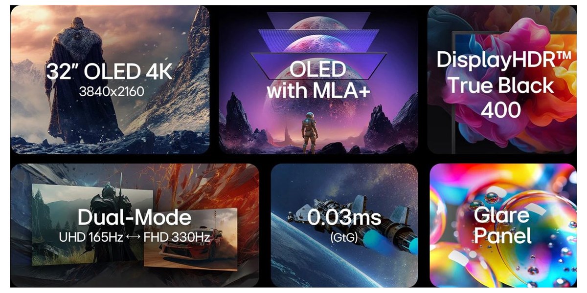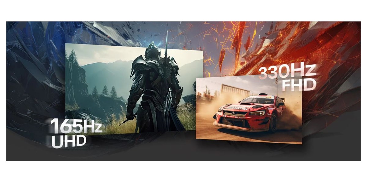 Le mode Dual permet de passer instantanément d’un affichage 4K à 165 Hz à un mode Full HD à 330 Hz. Cette flexibilité donne au joueur le choix entre la résolution maximale pour l’immersion et la vitesse ultime pour la compétition.