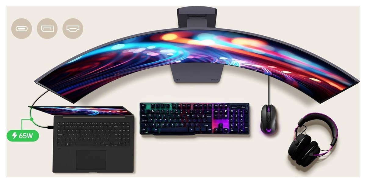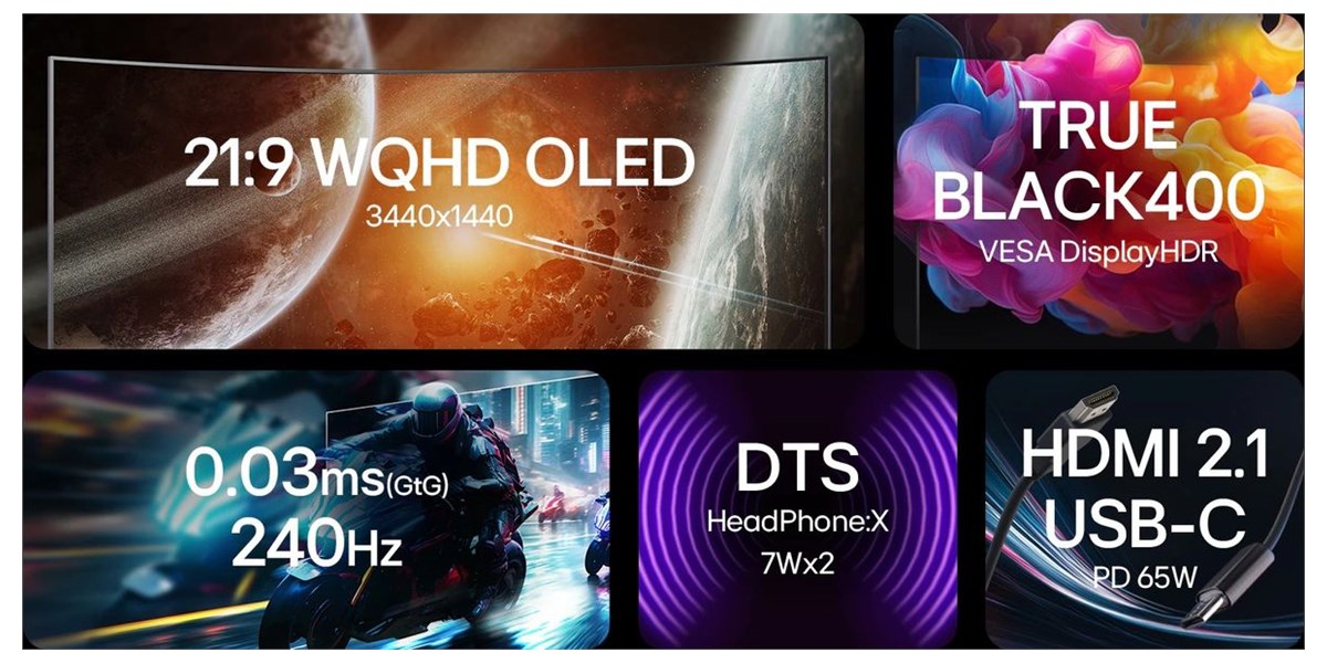Le moniteur dispose de deux ports HDMI 2.1, d’un DisplayPort 1.4 et d’un port USB-C avec alimentation 65 W. Il intègre aussi deux ports USB 3.0 et une sortie casque compatible DTS Headphone:X. Les haut-parleurs stéréo 2 x 7 W offrent un son immersif sans casque.
