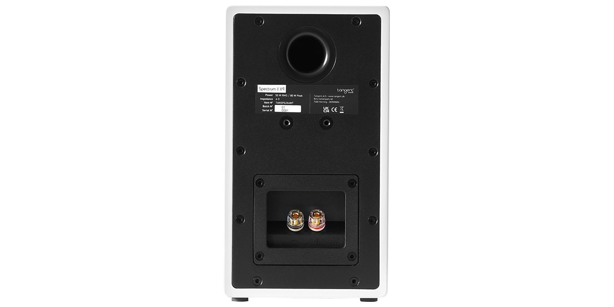 La Tangent Spectrum II X4 adopte une conception 2 voies bass-reflex avec évent arrière, pensée pour optimiser la réponse dans le grave malgré un format réduit. Elle est équipée d’un tweeter à dôme textile de 25 mm, offrant une restitution précise et aérienne des hautes fréquences, et d’un haut-parleur médium/grave de 10 cm en pulpe de cellulose, apprécié pour sa rapidité et son naturel. L’ensemble forme une scène sonore ample et équilibrée, parfaite pour les petites et moyennes pièces.