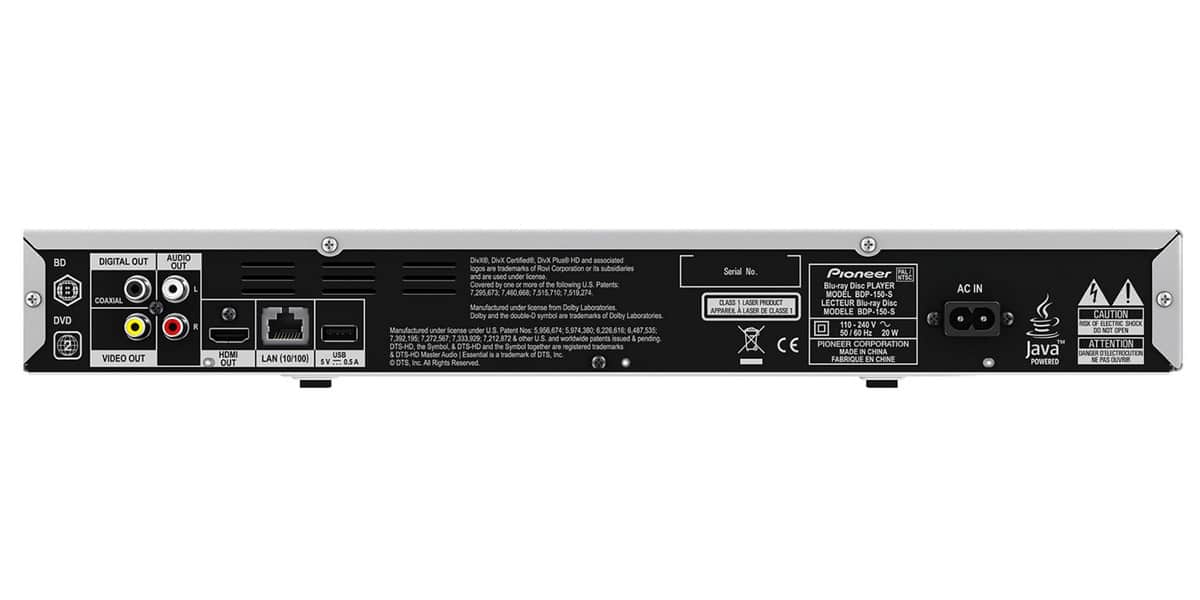 Connectiques :- 1 HDMI 1.4 (plaqué or) CEC 3D- 2 USB (avant/arrière)- 1 Ethernet (RJ45)- 1 sortie vidéo composite- 1 sortie coaxiale- 1 sortie audio analogique 2 voies| Marque | Pioneer |