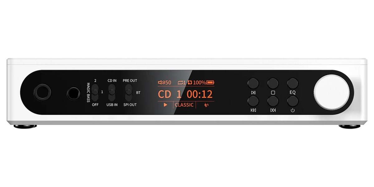 Le lecteur intègre une sortie ligne asymétrique (3,5 mm) et symétrique (4,4 mm), ainsi qu'une sortie optique/coaxiale. Il peut également ripper vos CD en fichiers WAV via USB-C. Le Bluetooth 5.4 assure une diffusion sans fil de qualité, avec prise en charge des codecs aptX, aptX HD, Adaptive et Low Latency. Un DSP intégré permet d’ajuster le rendu sonore avec trois niveaux de bass boost et huit profils d’égalisation, pour s’adapter à tous les goûts et casques.