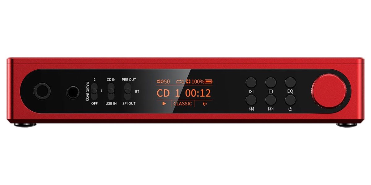 Le lecteur intègre une sortie ligne asymétrique (3,5 mm) et symétrique (4,4 mm), ainsi qu'une sortie optique/coaxiale. Il peut également ripper vos CD en fichiers WAV via USB-C. Le Bluetooth 5.4 assure une diffusion sans fil de qualité, avec prise en charge des codecs aptX, aptX HD, Adaptive et Low Latency. Un DSP intégré permet d’ajuster le rendu sonore avec trois niveaux de bass boost et huit profils d’égalisation, pour s’adapter à tous les goûts et casques.