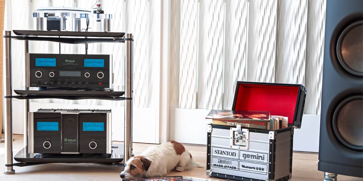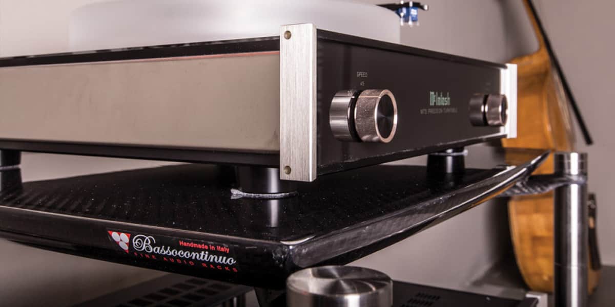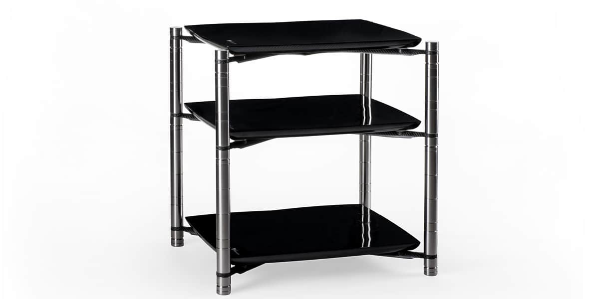 L'endosquelette du meuble est en carbone, un matériau utilisé en aéronautique et l'industrie automobile, grâce à ses qualités de raideur élevée et de très faible masse. Les étagères sont suspendues sur un gel technique à effet amortissant élevé, avec une aptitude de dispersion et d'absorption des chocs unique. Les étagères sont en LHPS, un matériau hybride qui réduit les vibrations directes des ondes de pression acoustique et améliore les performances sonores. Les pieds, ajustables en hauteur, sont en cuivre massif.