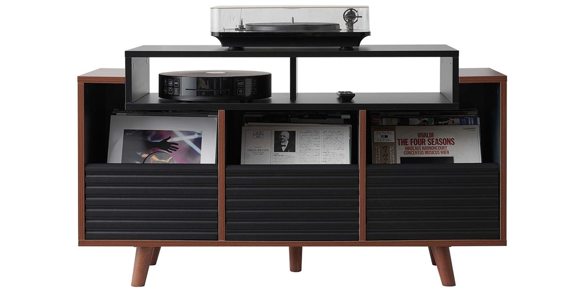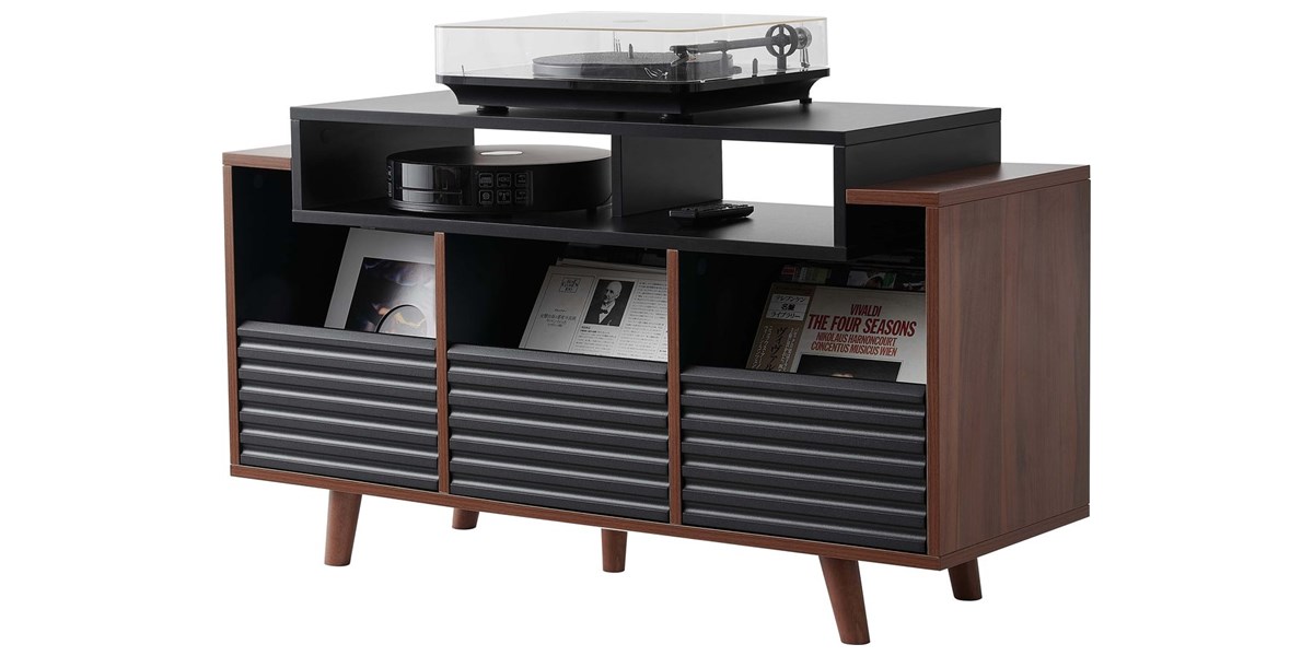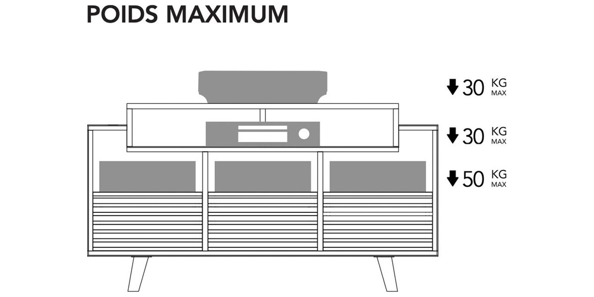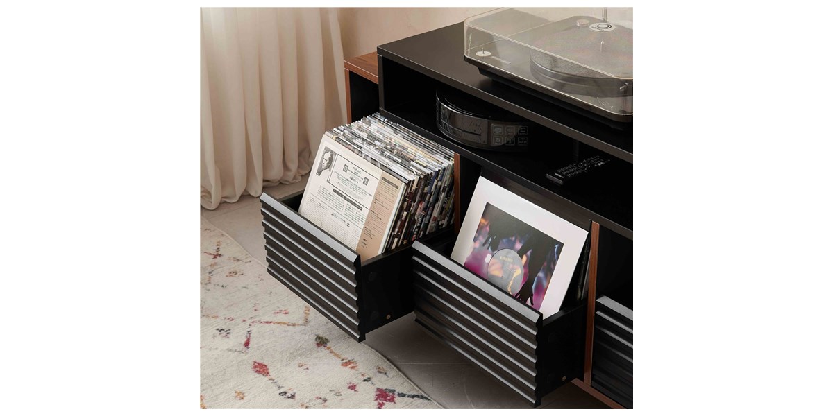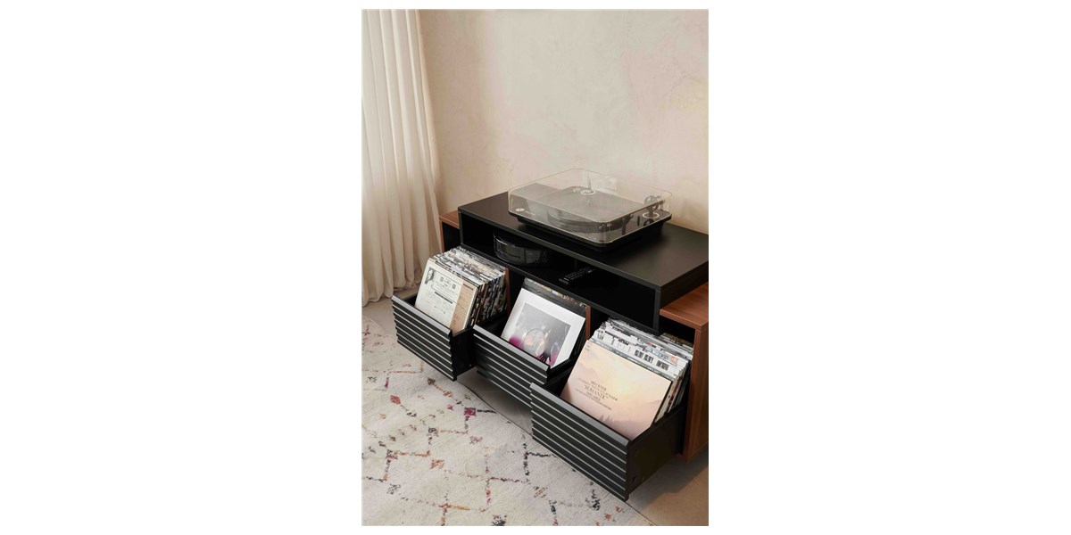 Ce meuble intègre trois tiroirs spécialement conçus pour le stockage des disques vinyle. Chaque tiroir peut accueillir jusqu’à 80 disques, soit une capacité totale impressionnante de 240 vinyles. Afin de garantir une tenue parfaite des disques, les tiroirs sont équipés d’un système de grip antidérapant, permettant de maintenir chaque vinyle droit, sans risque de glissement ou de déformation.