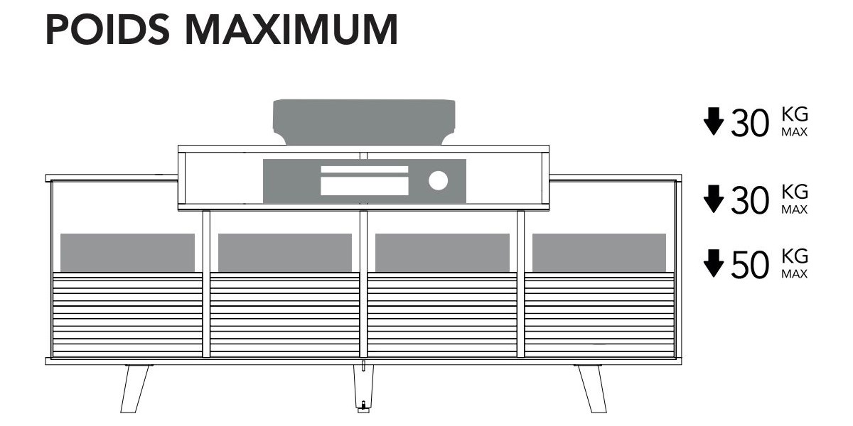 Le NorStone Oslo 1600 séduit par sa finition élégante et sa conception en bois mélaminé résistant. Son plateau supérieur, large de 93 cm, peut supporter jusqu’à 30 kg, convenant parfaitement à une platine vinyle ou une paire d’enceintes bibliothèque. La double niche centrale, également d’une capacité de 30 kg, permet d’intégrer vos électroniques de manière fonctionnelle et esthétique.