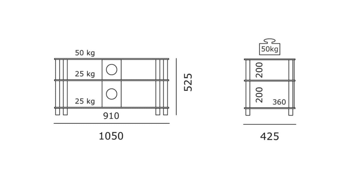Poids maximum supporté : 50kg pour le plateau supérieur et 25kg pour les deux autres étagères.