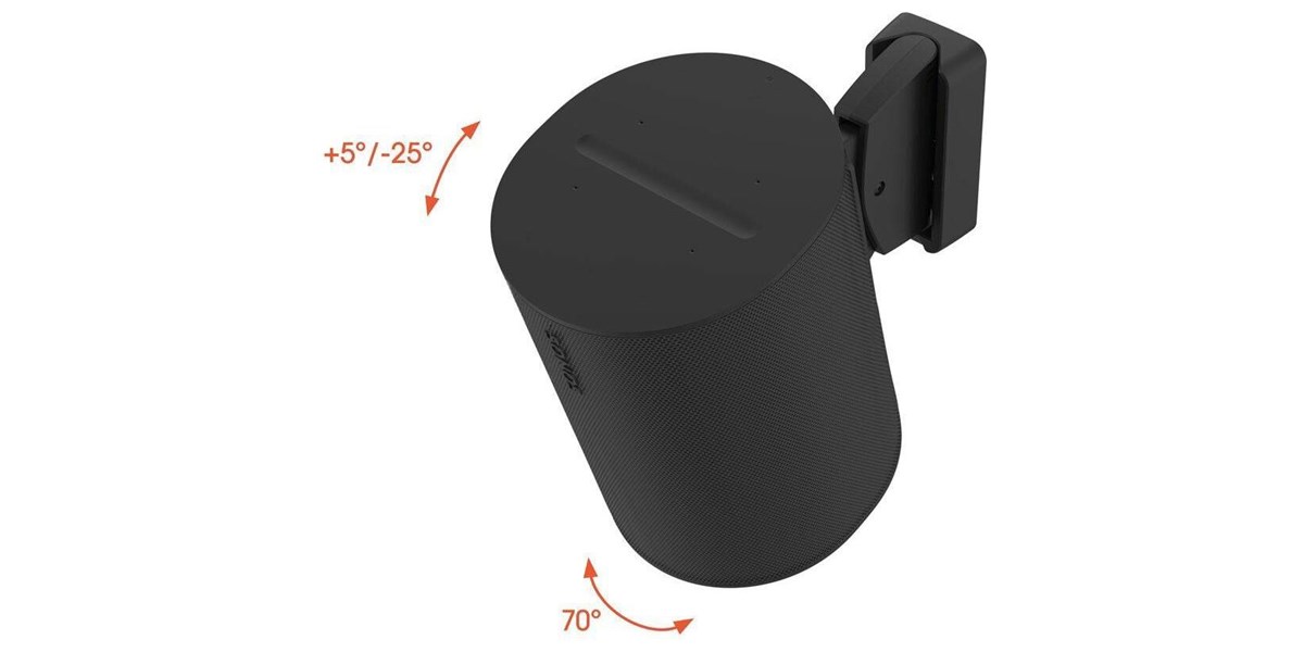 Le support offre une grande flexibilité d’installation grâce à ses capacités de réglage. Il peut être orienté jusqu’à 70° pour ajuster la direction du son vers la zone d’écoute. Il est également inclinable de 25° vers le bas et de 5° vers le haut, permettant d’adapter parfaitement la diffusion sonore selon la configuration de la pièce.