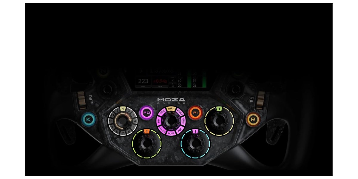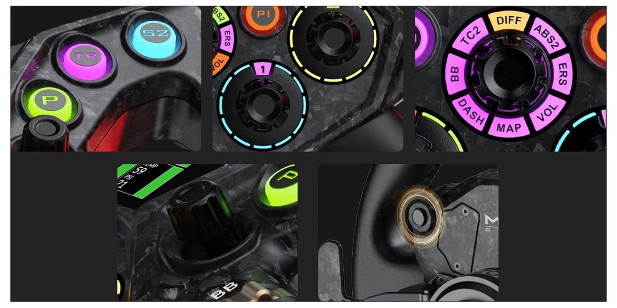 Les boutons RGB, encodeurs rotatifs et switches multifonctions offrent un accès direct à un grand nombre de réglages. Cette richesse de commandes permet de gérer efficacement tous les paramètres sans quitter le volant.