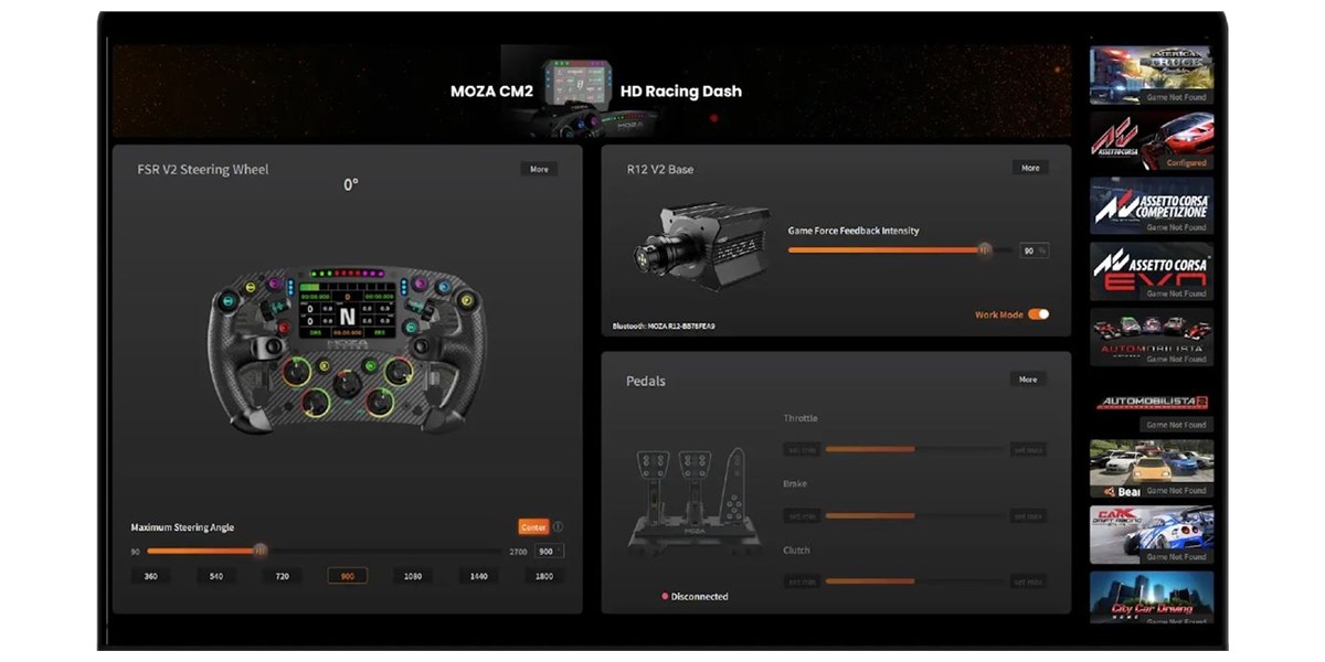 Le logiciel Moza Pit House constitue le centre de contrôle de la base. Il permet d'ajuster le retour de force en 19 points, de filtrer les vibrations, d’adapter la réponse du volant selon le véhicule, et de charger des profils préconfigurés pour les principaux jeux. L’application gère également les mises à jour firmware, assurant une base toujours optimisée et prête pour les évolutions du simracing.