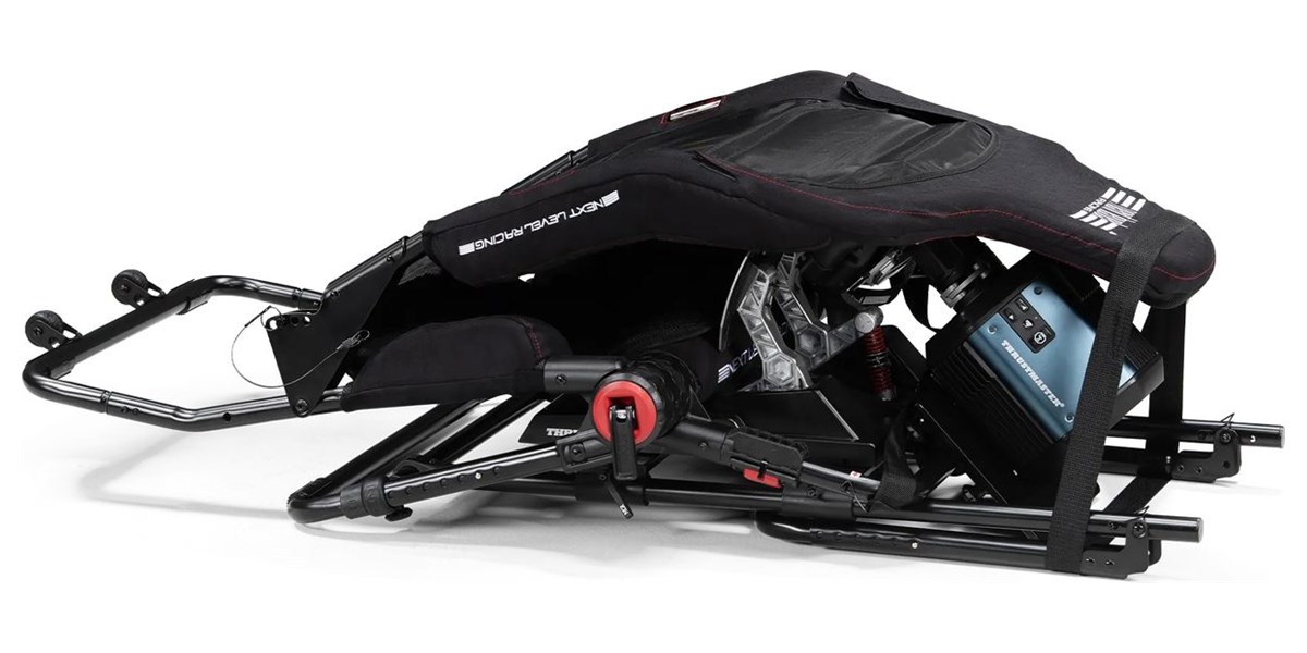 Le châssis tubulaire articulé utilise des hubs robustes permettant d’ouvrir et de replier rapidement l’ensemble. Une fois plié, le cockpit conserve les périphériques installés, évitant les démontages fastidieux entre deux sessions. Compact et léger avec seulement 15,7 kg, il se déplace facilement grâce aux roulettes intégrées. Cette conception hybride permet de profiter d’un poste stable en utilisation et discret une fois rangé.