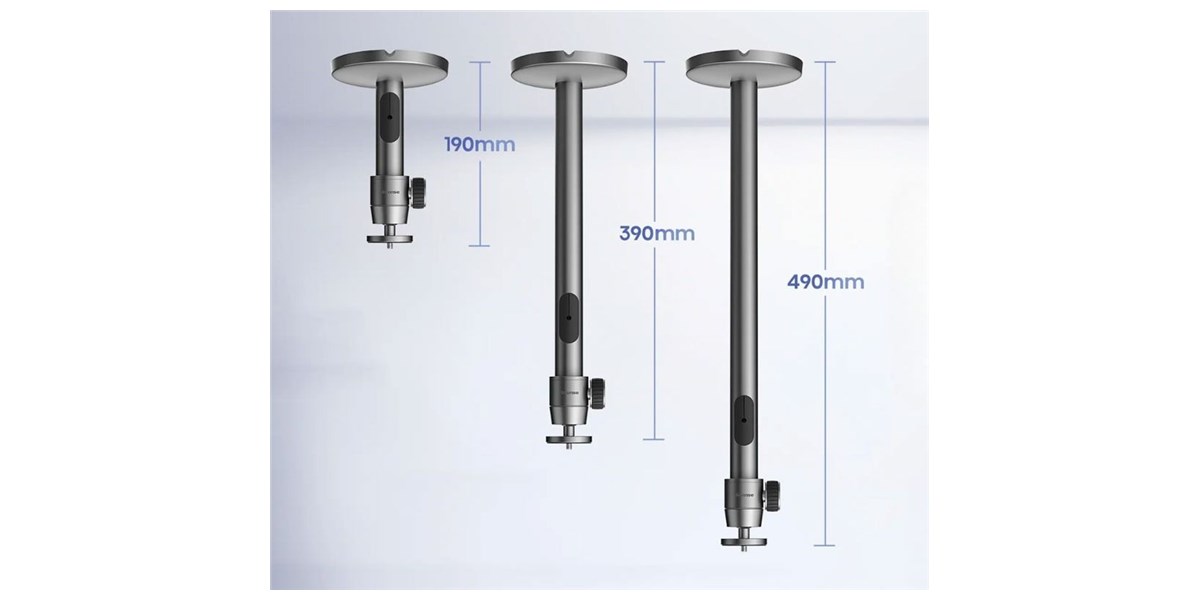 Le bras télescopique du support propose trois hauteurs de fixation : 190 mm, 390 mm et 490 mm. Cette modularité permet de s’adapter aux contraintes de la pièce tout en offrant la meilleure position de projection, que ce soit dans un salon, une salle dédiée ou un bureau.