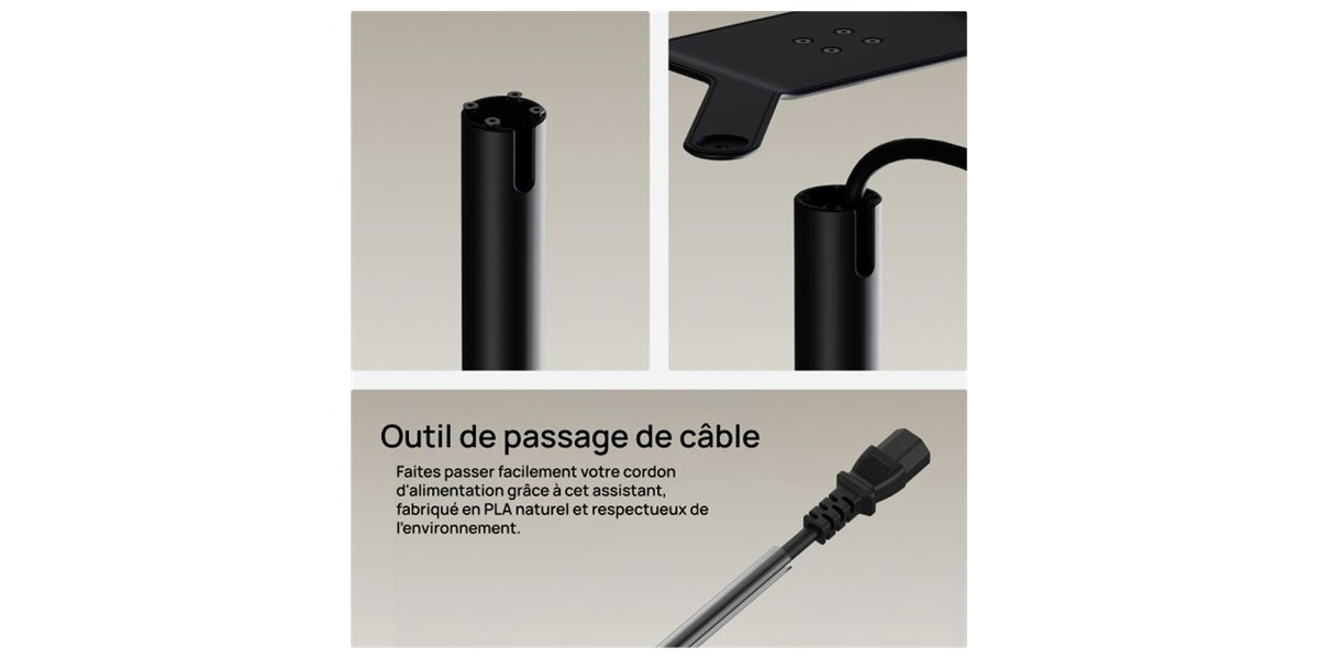 Le pied de sol intègre un passage de câble discret, permettant de dissimuler les fils d’alimentation pour un rendu épuré et professionnel. Cela contribue à la propreté visuelle de l’installation et évite les perturbations causées par des câbles mal rangés.