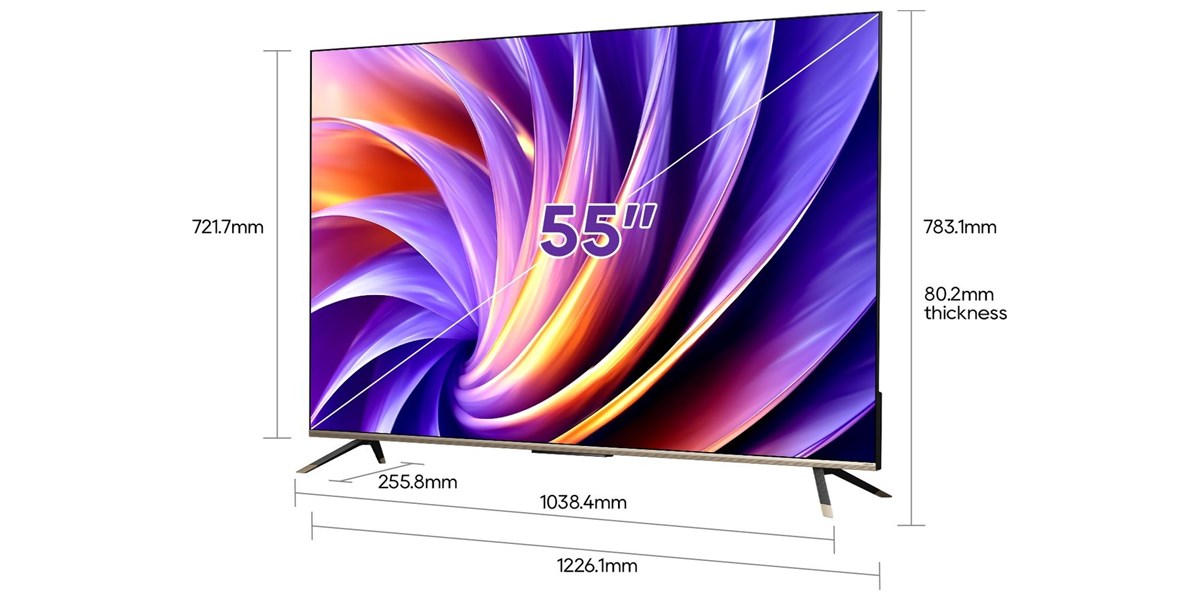 Avec sa diagonale de 55 pouces, ce modèle offre un excellent compromis entre immersion et intégration dans la pièce. Il apporte une belle présence visuelle sans monopoliser l’espace, ce qui le rend particulièrement adapté à un salon de taille moyenne ou à une grande pièce de vie. Cette taille convient aussi bien à un usage cinéma qu’à un usage polyvalent au quotidien. Son design avec barre décorative en métal doré et socle métallique en forme de harpe renforce sa dimension élégante. L’ensemble apporte une touche soignée qui valorise facilement l’espace d’installation. Le téléviseur s’intègre avec naturel dans des intérieurs contemporains comme dans des ambiances plus classiques. Ses dimensions permettent une installation sur meuble avec un encombrement maîtrisé. Cette configuration facilite la mise en place dans différents environnements domestiques. L’écran trouve ainsi facilement sa place comme élément central de divertissement.