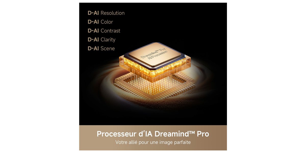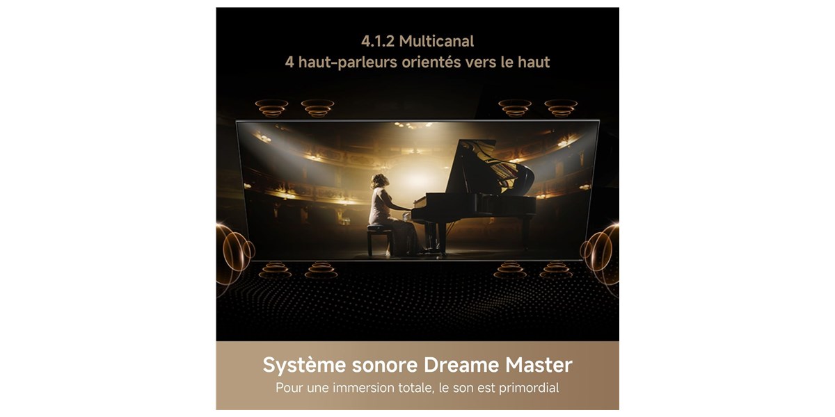 La Dreame S100 55" s’impose comme une solution moderne pensée pour offrir une expérience audiovisuelle immersive et polyvalente. Elle combine des technologies d’affichage avancées, un système audio performant et une interface connectée intuitive afin de répondre aux attentes des utilisateurs exigeants. Son écran QLED+ associé au rétroéclairage Mini LED permet de profiter d’une qualité d’image impressionnante avec des contrastes marqués et des couleurs éclatantes. Grâce à sa luminosité élevée et à sa compatibilité avec les formats HDR, elle garantit une restitution fidèle et dynamique des contenus. Conçue aussi bien pour le cinéma que pour le gaming ou le streaming, elle propose une expérience complète dans un design élégant et moderne.