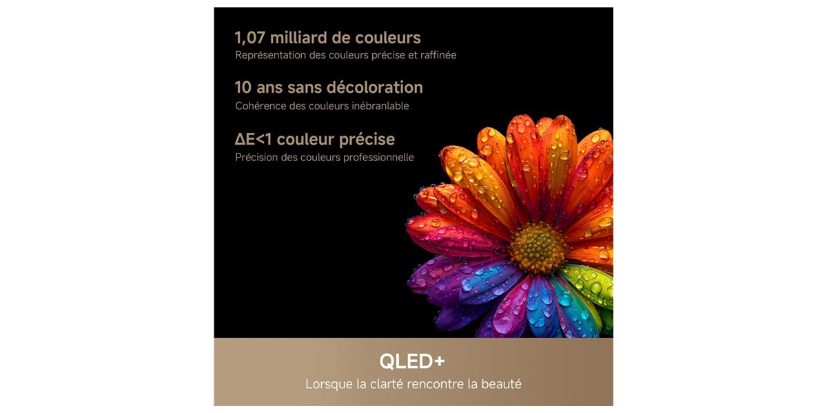 Le rétroéclairage Mini LED repose sur l’utilisation de nombreuses diodes permettant un contrôle précis de la luminosité. Cette technologie améliore considérablement les contrastes en offrant des noirs profonds et des zones lumineuses bien maîtrisées. L’ajout de la technologie QLED+ permet d’obtenir des couleurs plus riches et plus fidèles. Les images gagnent en intensité et en naturel, quel que soit le type de contenu. Cette combinaison assure un rendu visuel équilibré et immersif.