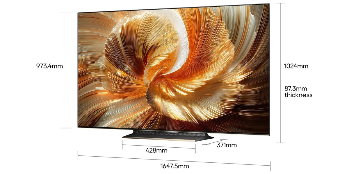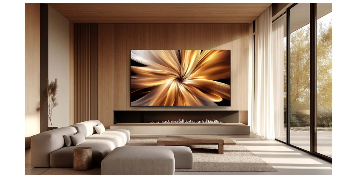 Le design fin et épuré met en valeur la grande taille de l’écran. Le cadre discret permet de se concentrer pleinement sur l’image. Les matériaux utilisés apportent une finition soignée et moderne. Le pied en métal assure stabilité et élégance. L’ensemble s’intègre harmonieusement dans un salon ou une pièce dédiée au home-cinéma.
