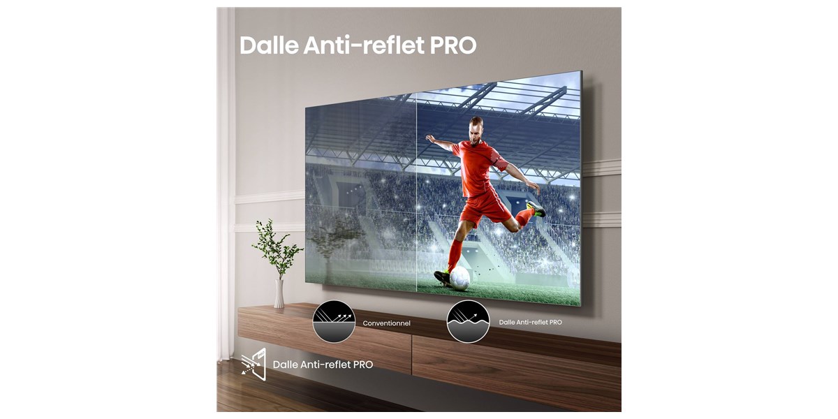 Le Hisense 100U8Q utilise une dalle Mini-LED Pro, capable de contrôler la lumière de manière ultra précise grâce à des milliers de mini LED. Cette technologie, associée au local dimming, améliore considérablement les contrastes, offrant des noirs profonds et des blancs éclatants. Résultat : une image vive, nette et homogène, même dans les pièces très lumineuses, sur une diagonale de 100 pouces.