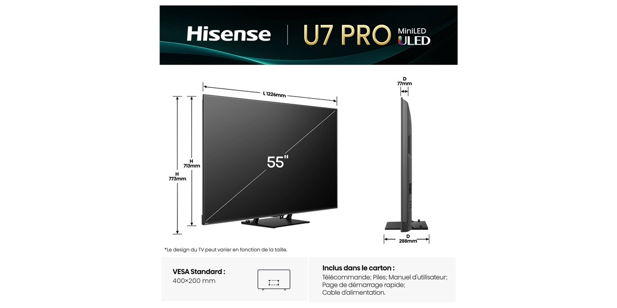 Le Hisense 55U7Q Pro combine design compact, image haute performance et fonctions gaming avancées dans un format 55 pouces parfaitement équilibré. Grâce à sa dalle Mini LED QLED 4K, sa compatibilité HDR de dernière génération et un système audio Dolby Atmos immersif, il assure une expérience visuelle et sonore idéale pour le cinéma ou les jeux vidéo. Sa fréquence jusqu’à 288 Hz et sa connectique complète HDMI 2.1 séduiront les utilisateurs à la recherche de fluidité et de réactivité.